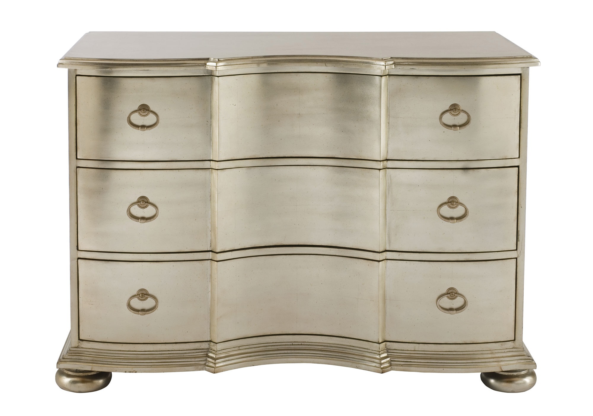 The Amboise chest of drawers from the American manufacturer Bernhardt. Original model with curved facade has three large drawers. The body and legs are made from wood. The finishing is executed under the silver.