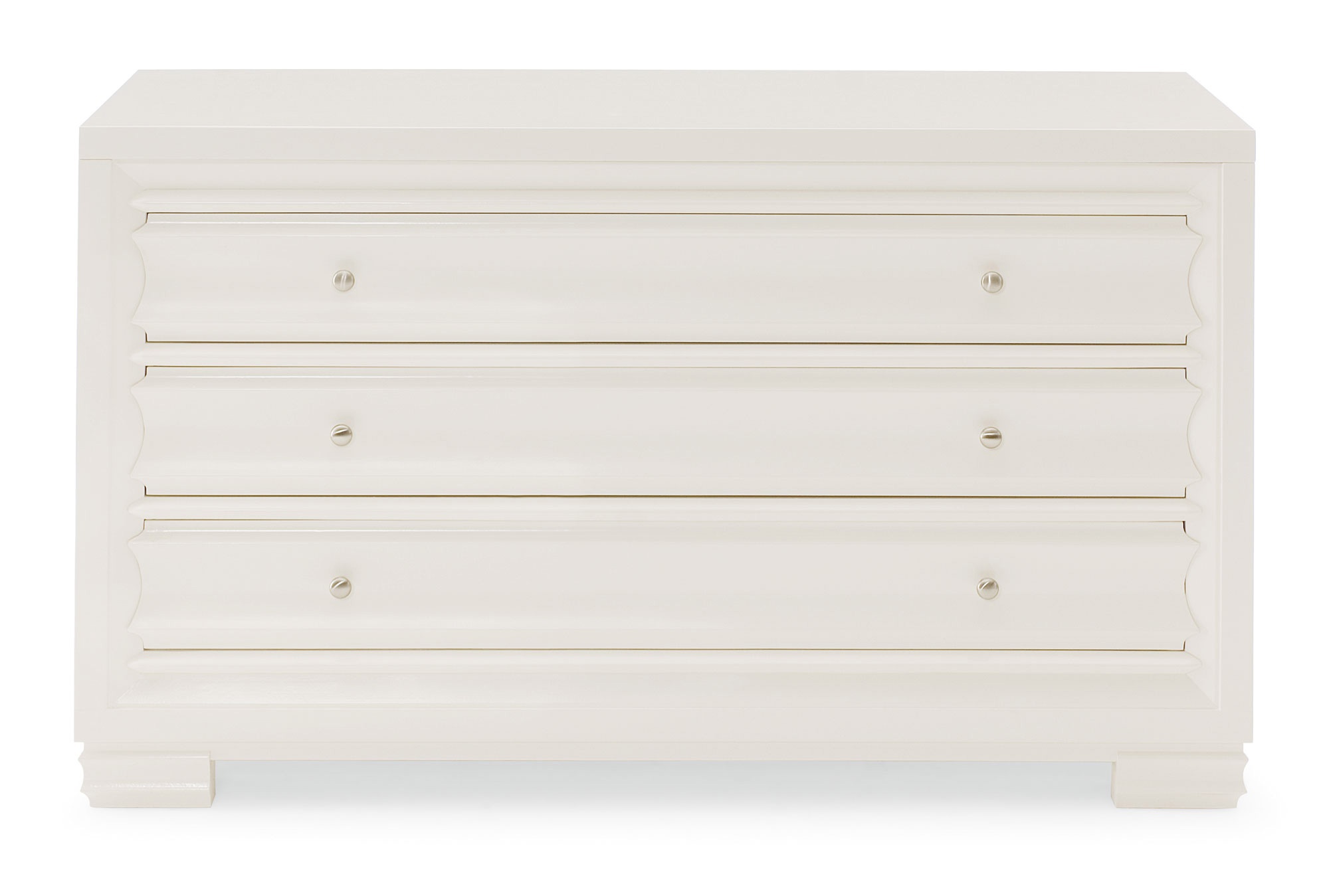 Dresser Doyle from the American manufacturer Bernhardt. The model with three large drawers. The body and legs are made from wood. The finish trim is made of ivory and lacquer. Modern chest of drawers for the bedroom.