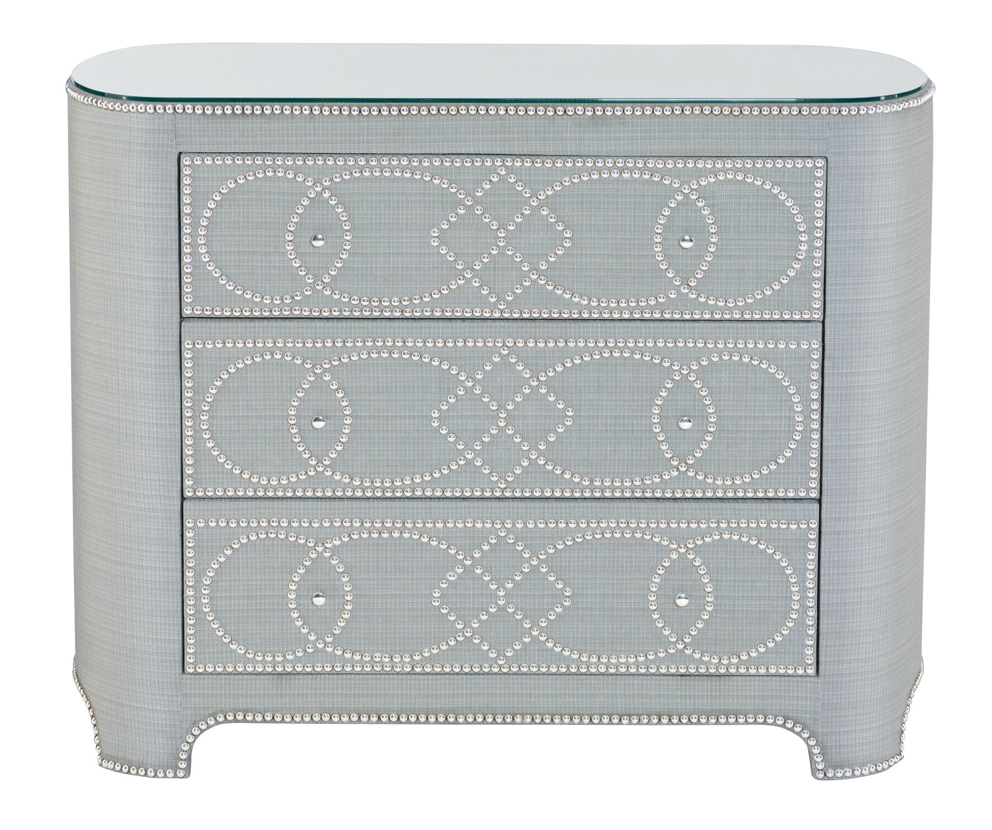 Chest Villette from the American manufacturer Bernhardt. The original model was made of wood wrapped with a cloth. The dresser has three drawers. The facade of the boxes are decorated with brass studs. The table top is made of tempered glass.