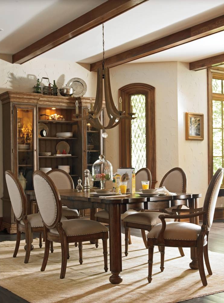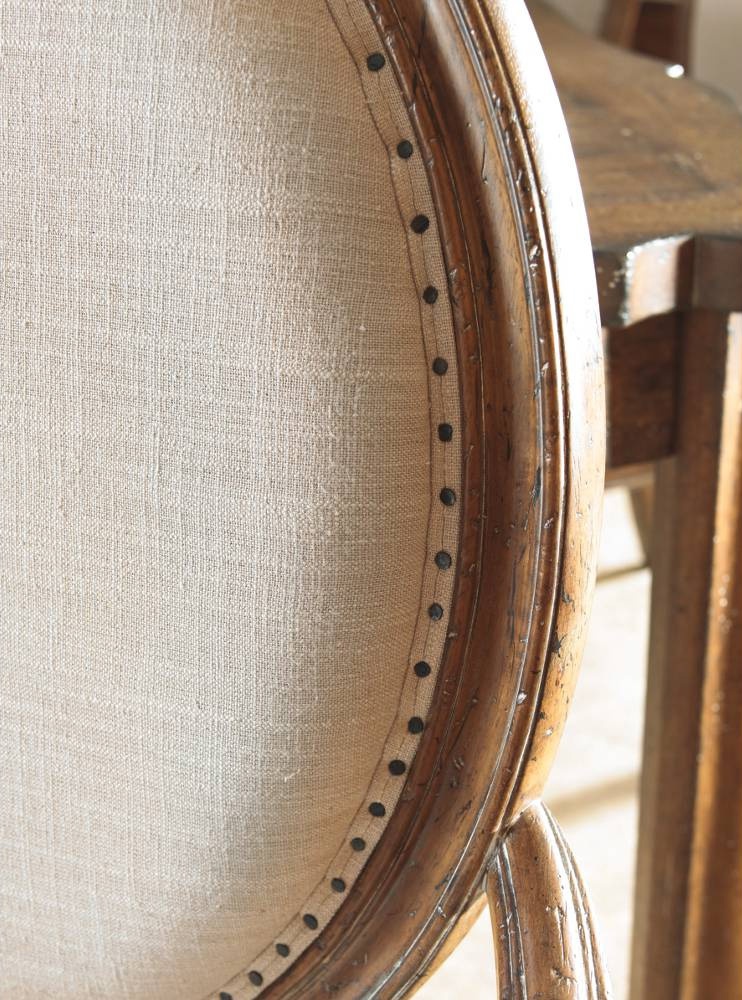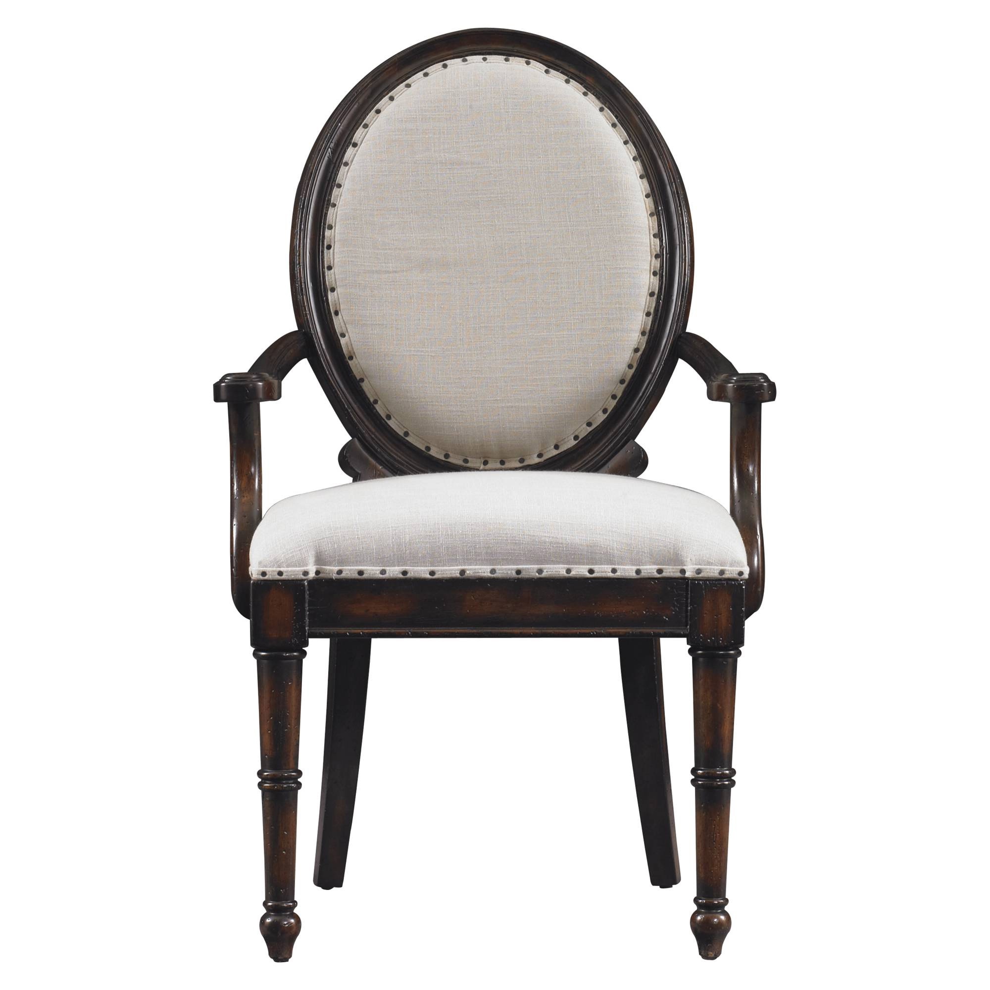 Chair with armrests Million Stars from the American manufacturer Stanley Furniture. Made with a mahogany frame with carved legs and armrests. Model with round back - the medallion. Exquisite and stylish upholstery fabric from the collection of the factory. Decor furniture are cloves around the perimeter of the seat and backrest.