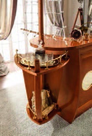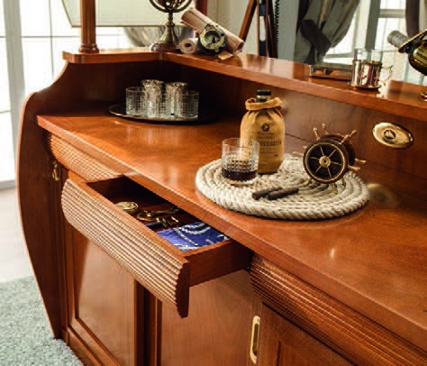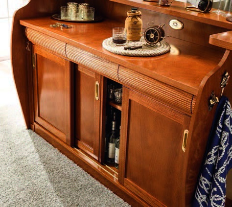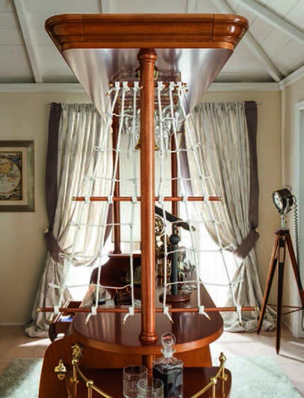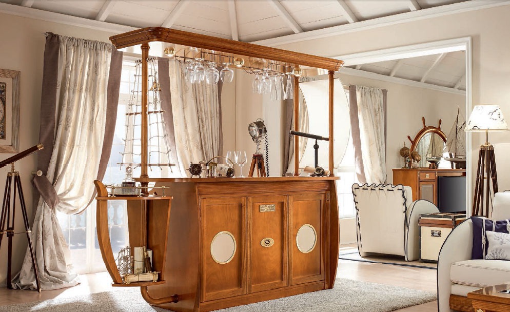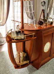 Bar Caravella Italian manufacturer Caroti. The model for the bar in the form of a ship. Equipped with drawers, hanging Cup holders and shelves for storing bar accessories. Frame of furniture is made of natural mahogany wood, lacquered, handles and fittings of brass. Design solution for the interior in Maritime style.