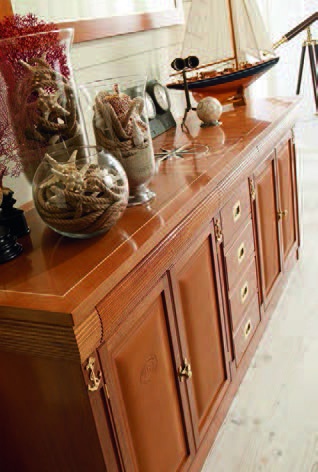 The buffet Sestante Italian manufacturer Caroti. The sideboard is made of natural mahogany with drawers and hinged doors, upholstered in natural leather colours to choose from the catalog factory. Decorated with a manual carving. Colors in light brown tones. The design for classical dining room interior.