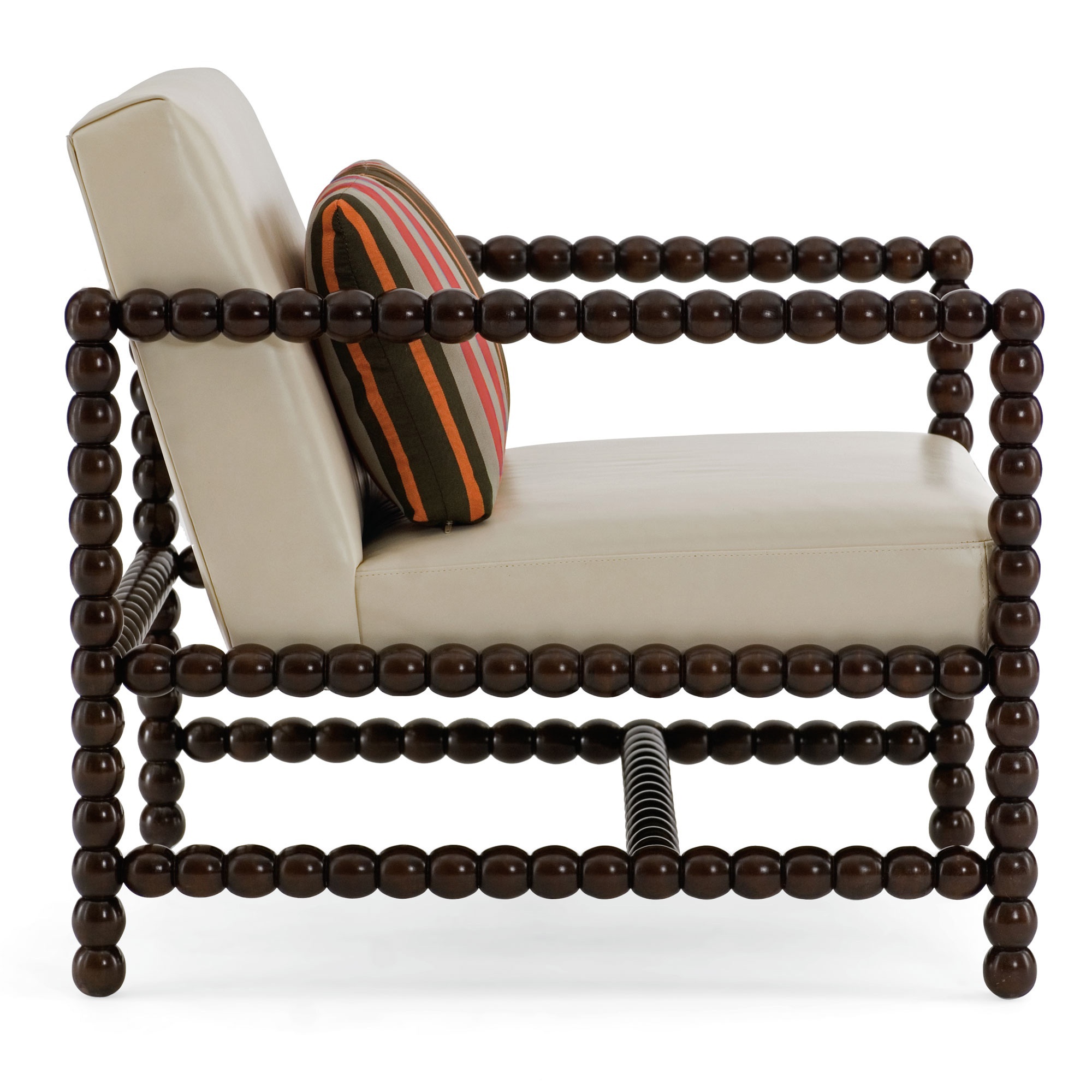 Chair Austin from the American manufacturer Bernhardt. The model with armrests and low backrest. Carved frame and armrests made of wood. The upholstery is made of textile fabric, it is also available upholstered in leather. Complements design decorative pillow.