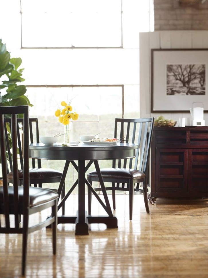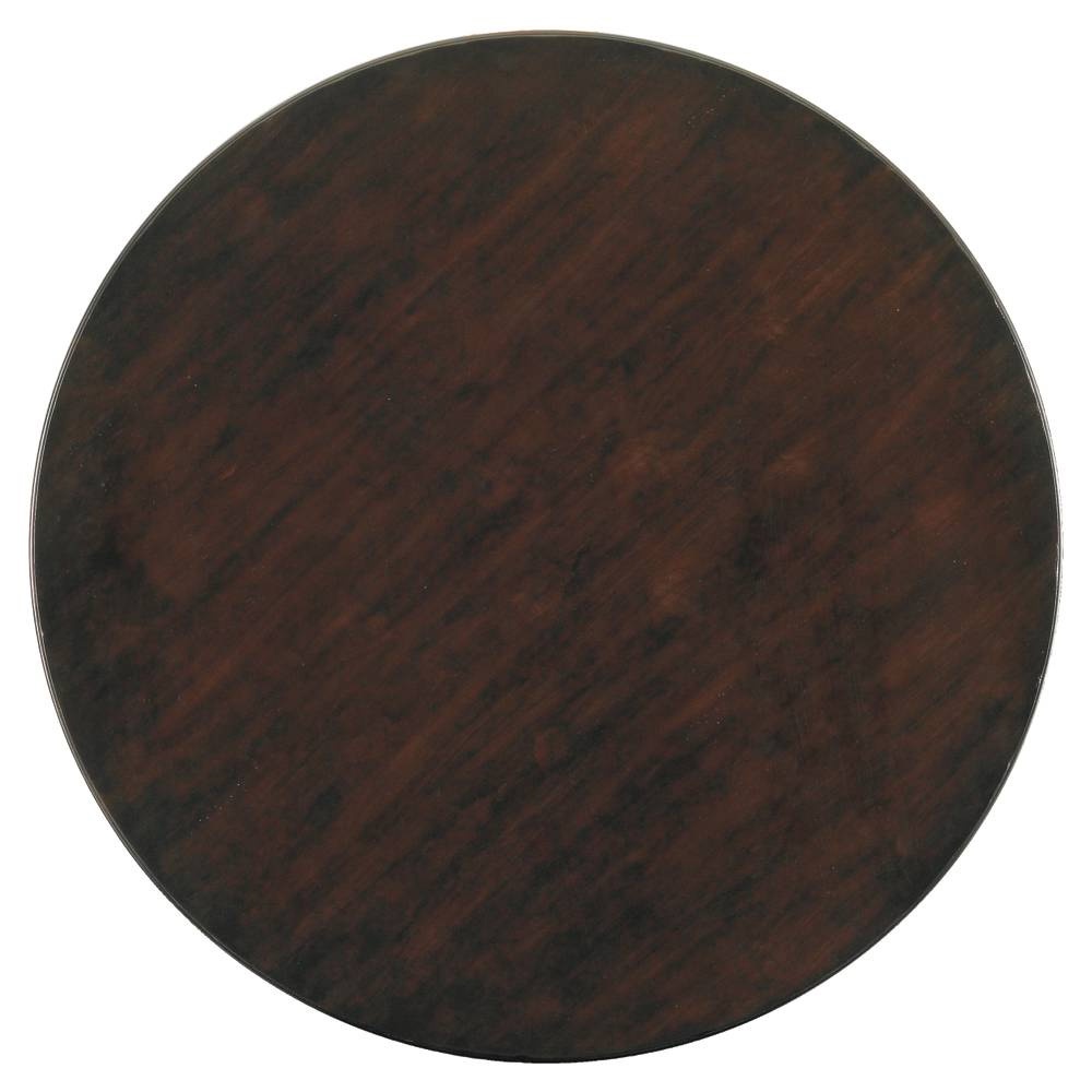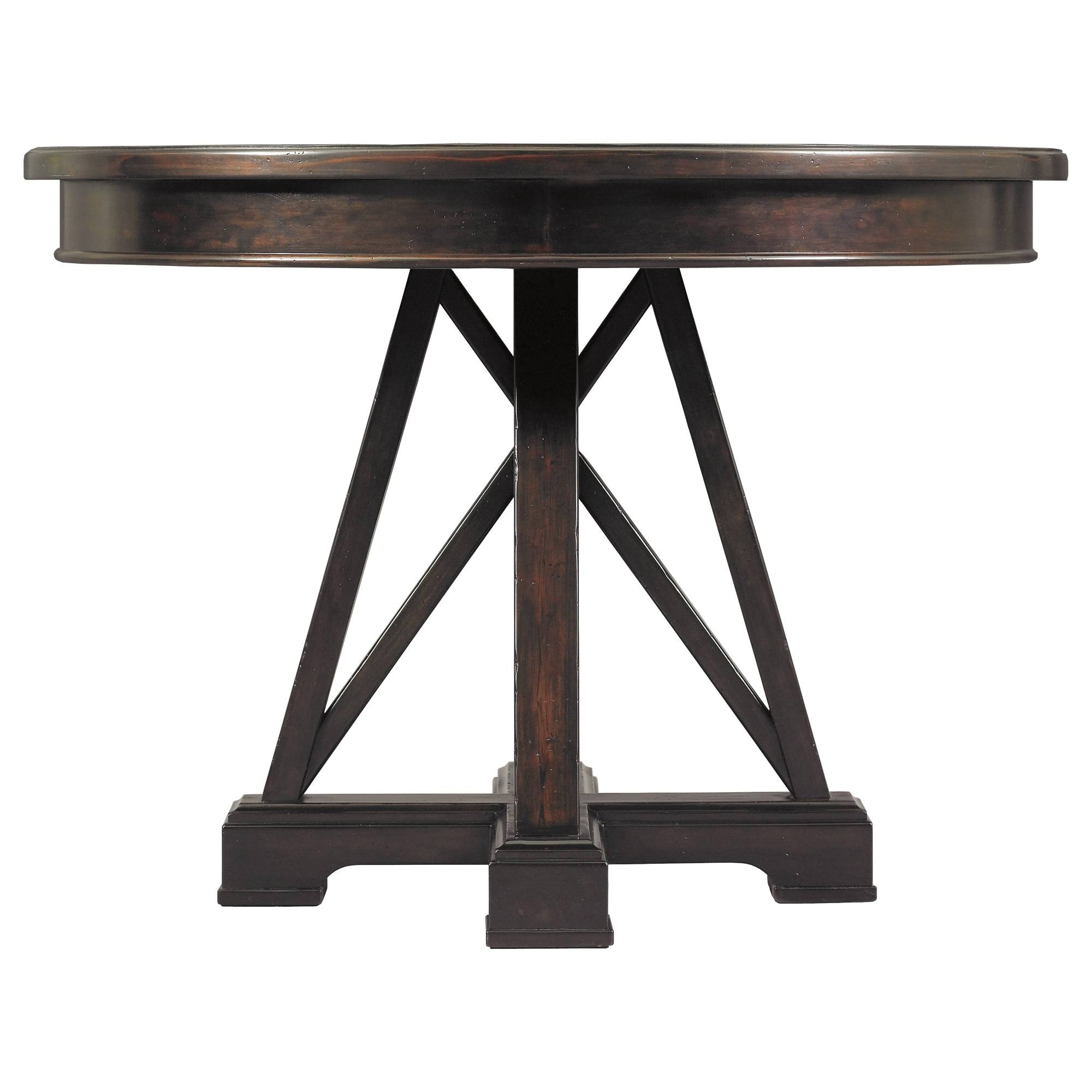 The Red House Revival table from the American manufacturer Stanley Furniture. The frame is made of wood. Maple top is a reminder of the Renaissance era. Model with round top with strong diagonal braces. The surface is covered with lacquer from the collection of the company. The finish is an aged finish that makes the table attractive. Colours in stock.