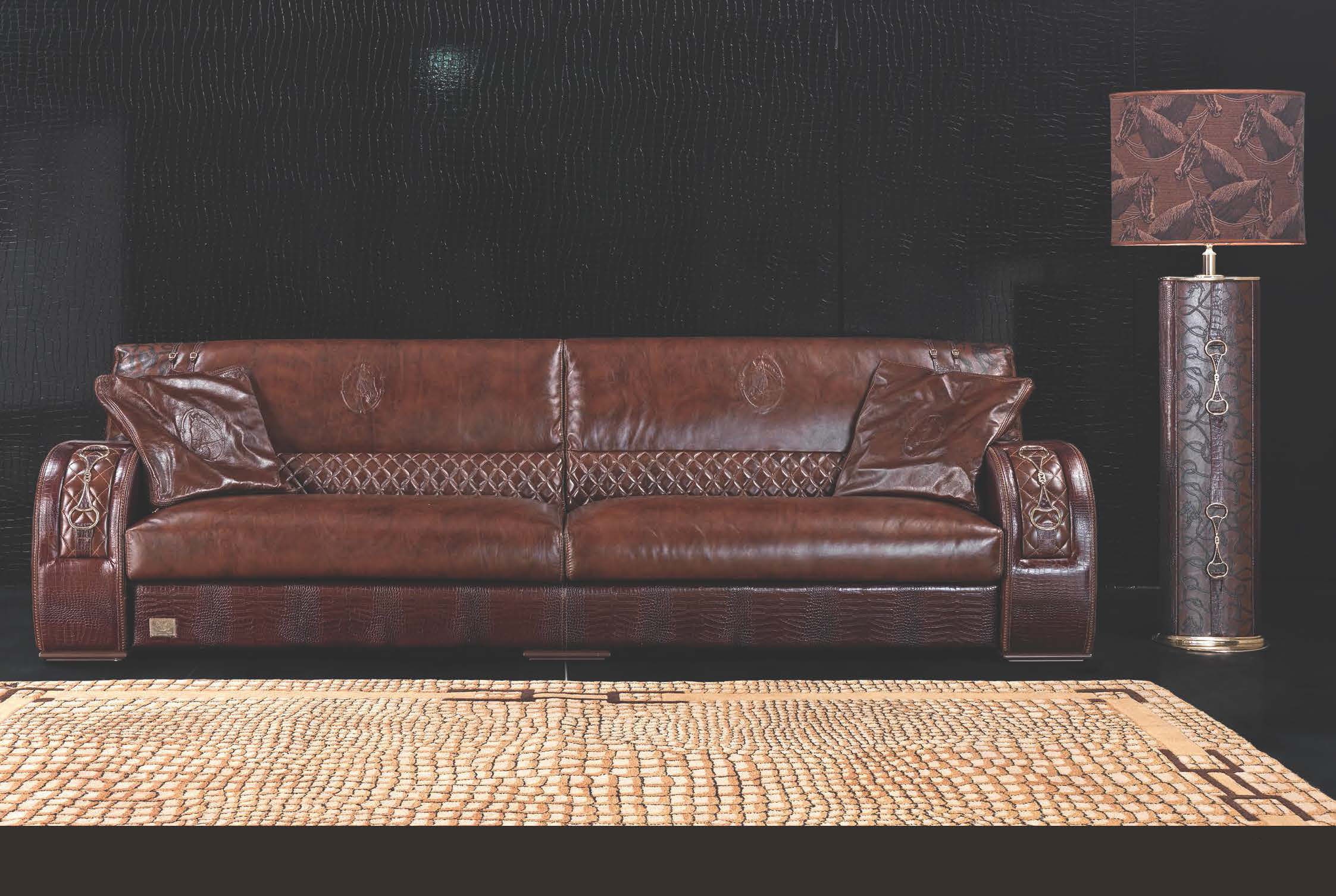 | Description: | The four-seater Ascot sofa 911 from the Italian manufacturer Formitalia. Upholstery - leather horses choco, longchamp choco & new cocco tobacco, tobacco color. Finish on the photo. |
