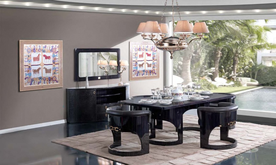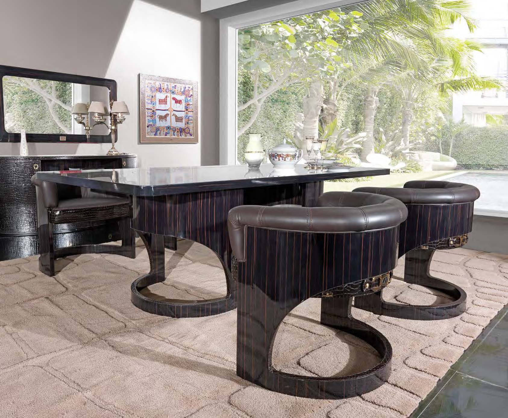 Dining room set for Chelsea from the Italian manufacturer Formitalia, the collection Boutique. A table made of wood with a glossy finish with dark brown glass insert, legs are with inserts in crocodile leather coffee color. Chairs in wood and leather upholstery with decorative metal elements. Offers a wide range of colors.