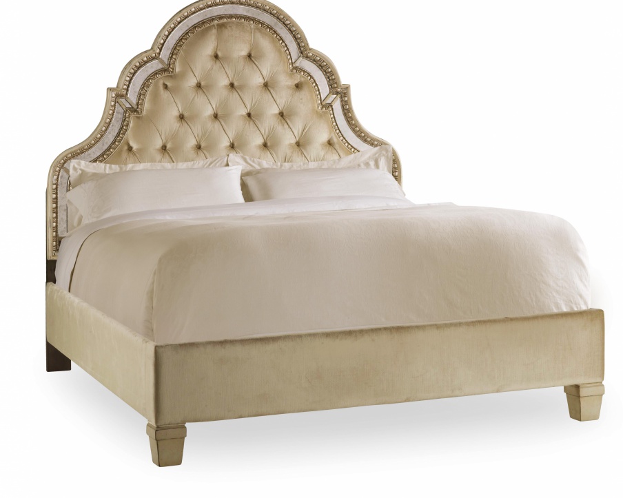 Double bed the Sanctuary of the American manufacturer Hooker Furniture. Model double bed with high headboard in a soft upholstery. The headboard is a wooden frame decorated with hand carving. Color ivory. The classic solution for a modern bedroom.