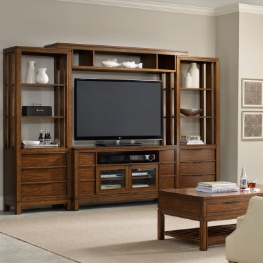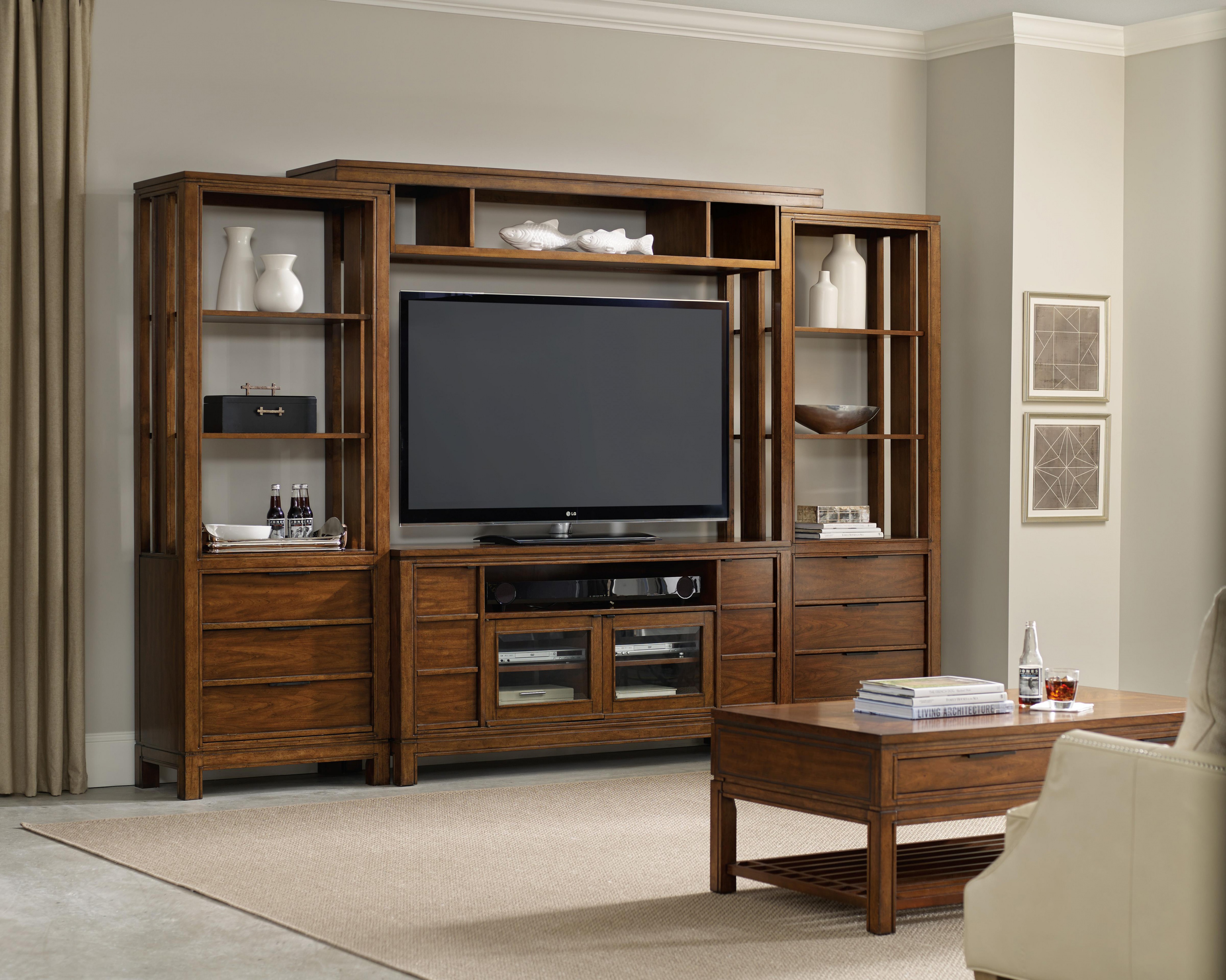 Furniture for TV Chatham American manufacturer Hooker Furniture. Furniture made of natural wood, equipped with open shelves and cabinets with glass doors. There is a place to install the TV and necessary accessories. The color of the furniture dark wood. Will perfectly complement a living room in classic style.