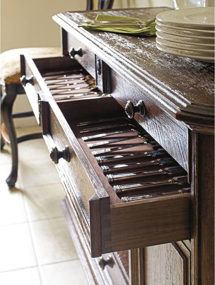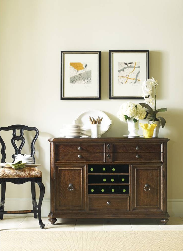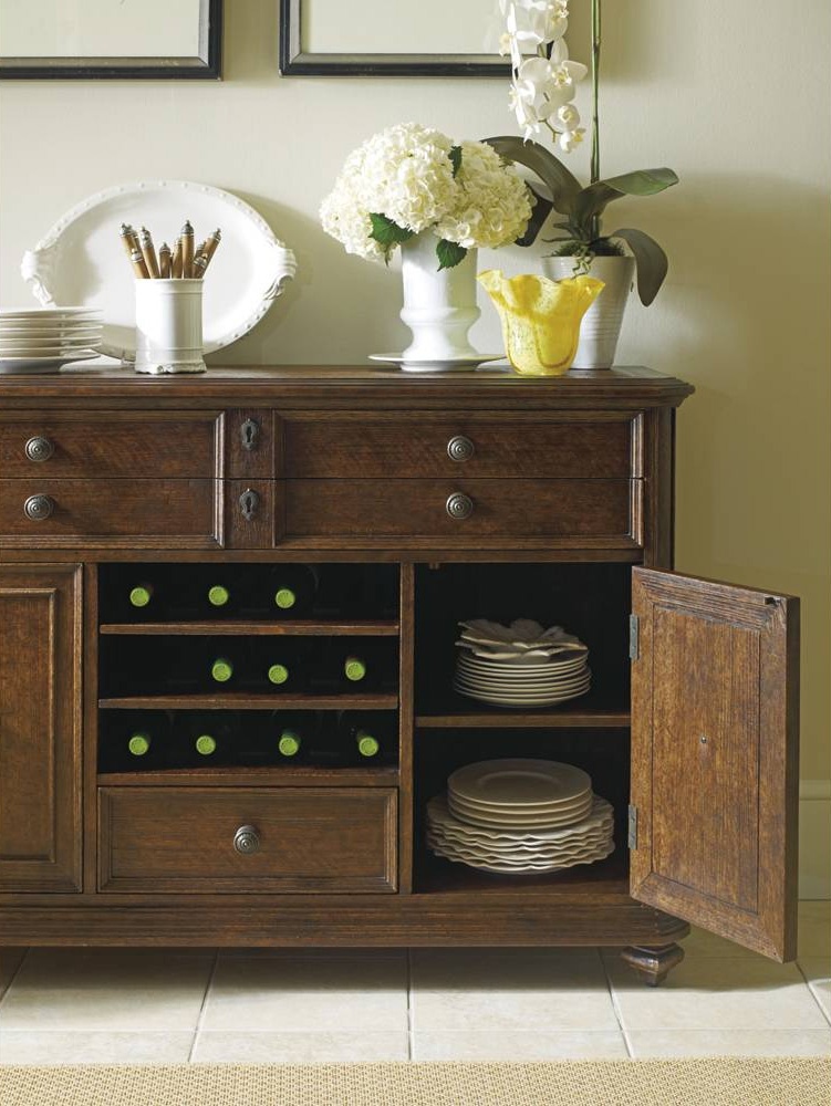 The Rustica sideboard from the American manufacturer Stanley Furniture. Made of walnut and carved moldings handmade. Two wing doors, three drawers and three shelves to store wine bottles. The metal fittings of antique finishes. A majestic design. The charm lies not only in the abundance of storage space, and offers a variety of equipment shelves and drawers.