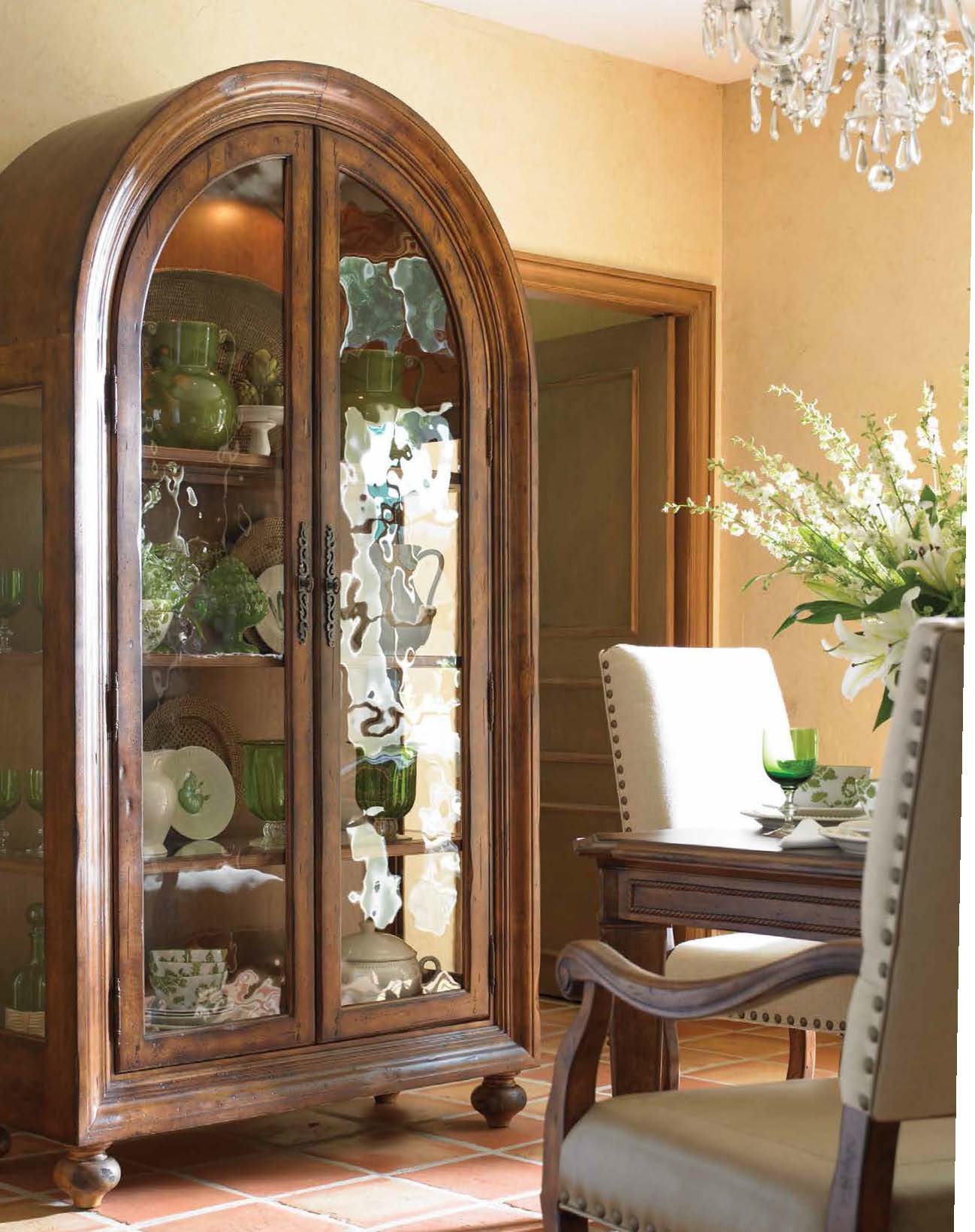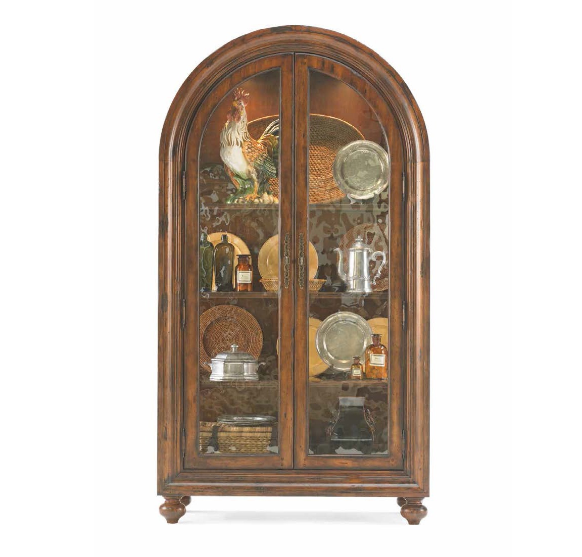 Showcase American manufacturer Hickory White. Presents a model for low round legs with double doors with glass top. The sidewalls of the showcases of glass. The frame showcases made of wood. A beautiful combination of dark wood tones and decorative items from metal. This showcase has internal illumination. The classical solution for the interior of the dining room.