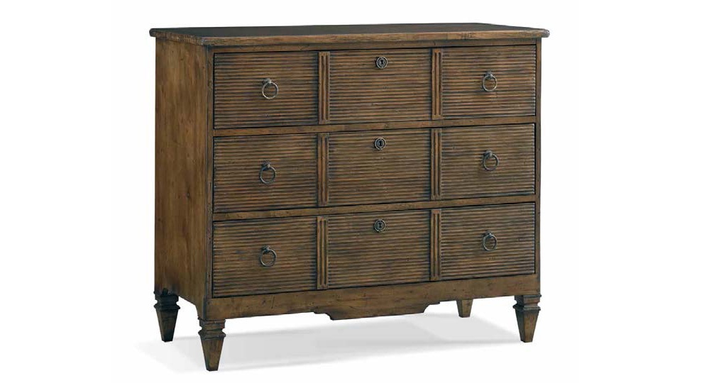 The Hanna Chest of drawers American manufacturer Hickory White. Presents the short curly chest on legs with three drawers. The color of the dresser is dark brown. The handle is made of metal bronze. A modern solution for living room.