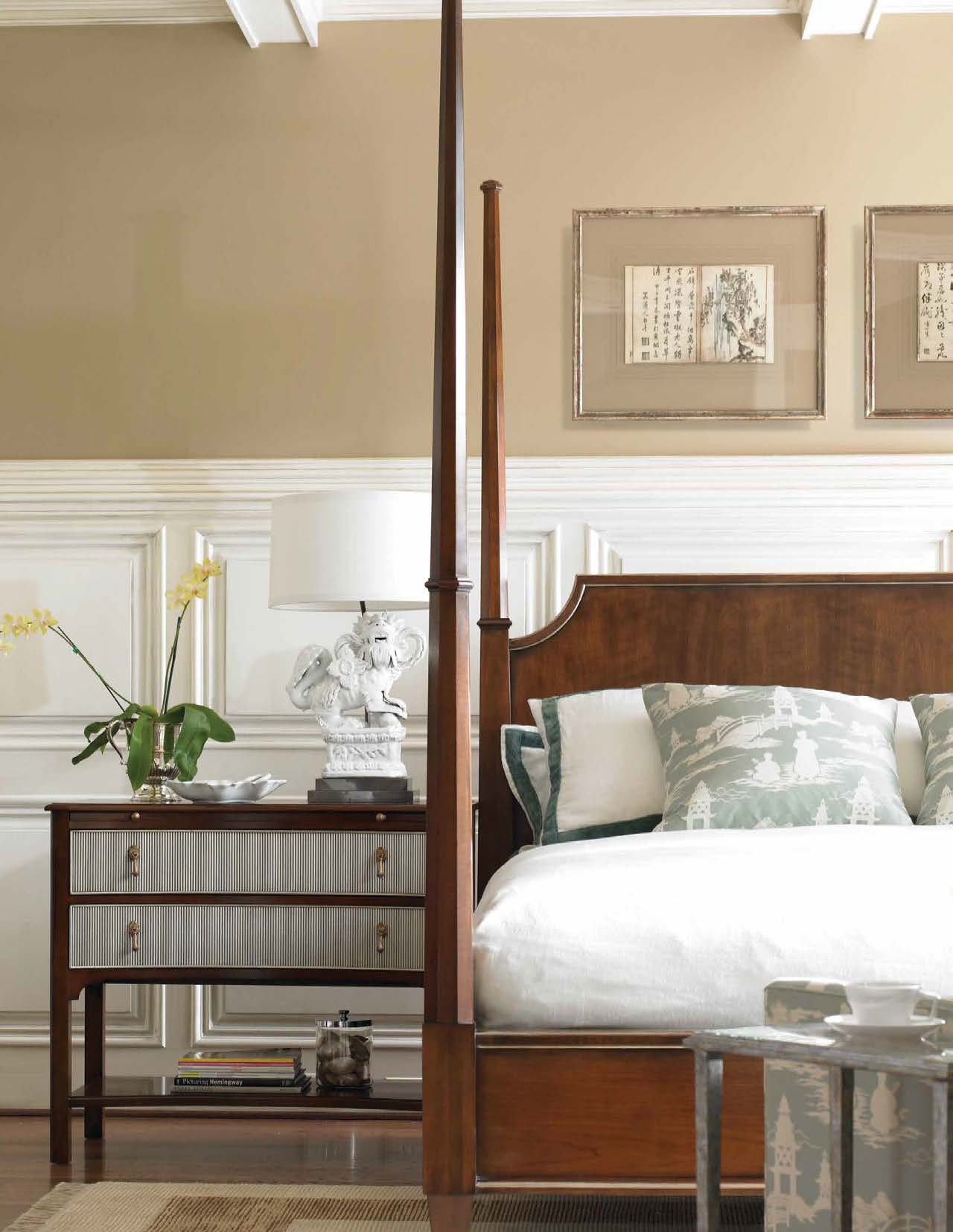 Double bed King Poster American manufacturer Hickory White. Presents a model bed with high headboard legs tapered. The corners of the high peaks. The frame is made of natural wood. The color of the bed is brown. The classical solution for the interior bedroom.
