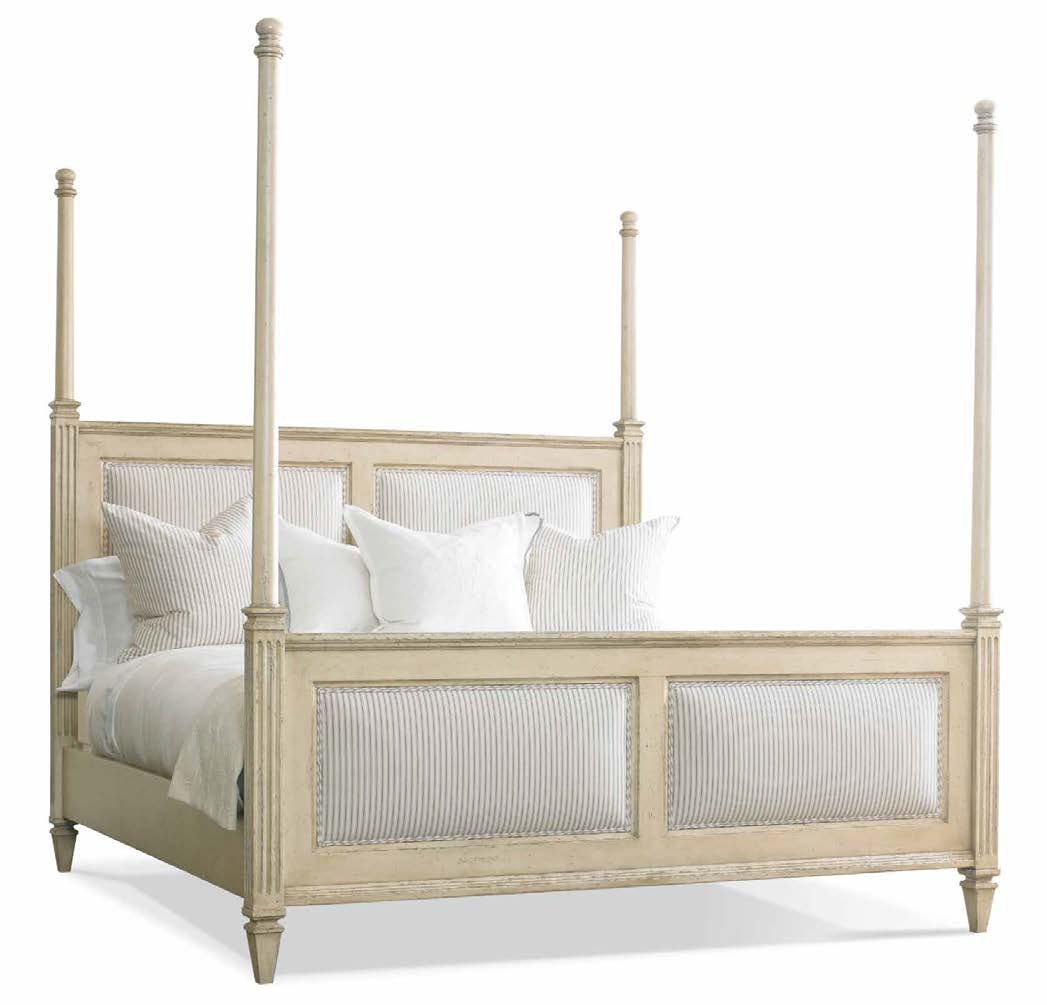 Double bed King Hi-Lo Upholstered American manufacturer Hickory White. The presented model beds with high spies at the corners. The sides are decorated with textiles in the form of squares. Panels and corners are decorated with a manual carving. A style classic.
