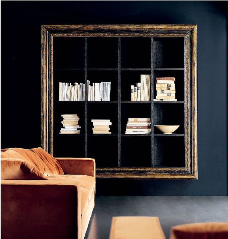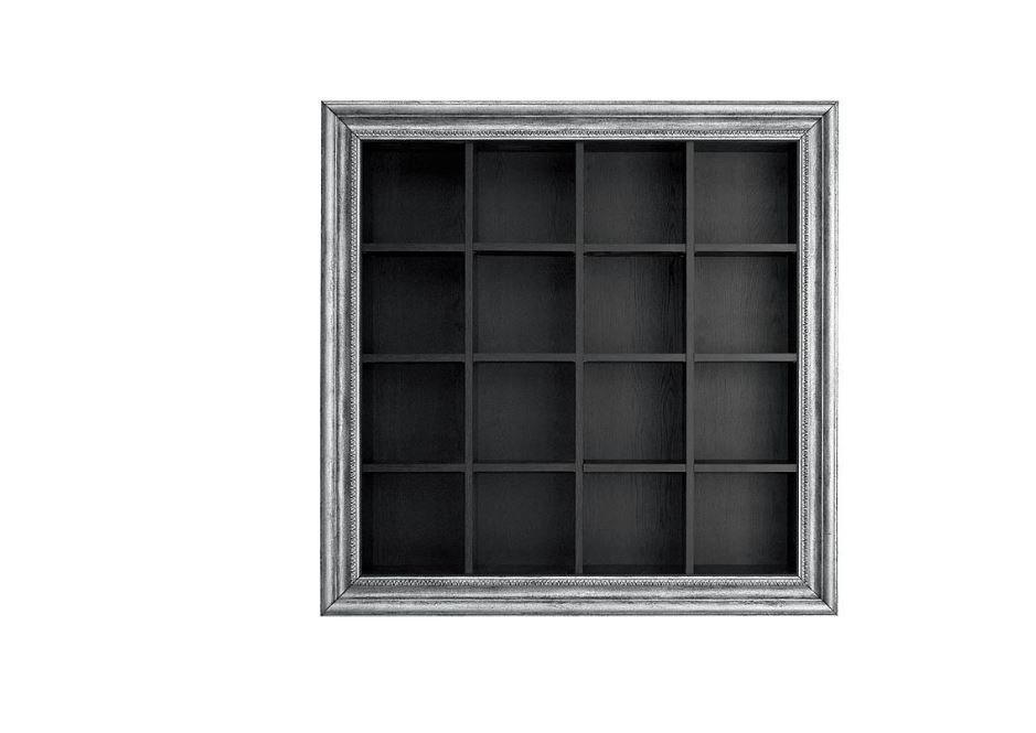 Wall shelf for books Casablanca from the Italian manufacturer EGO. The frame and inner shelves made of oak, frame made of natural wood. Model with lots of open shelves ornate carved frame with silver finish. Regiments represented in dark grey and brown.