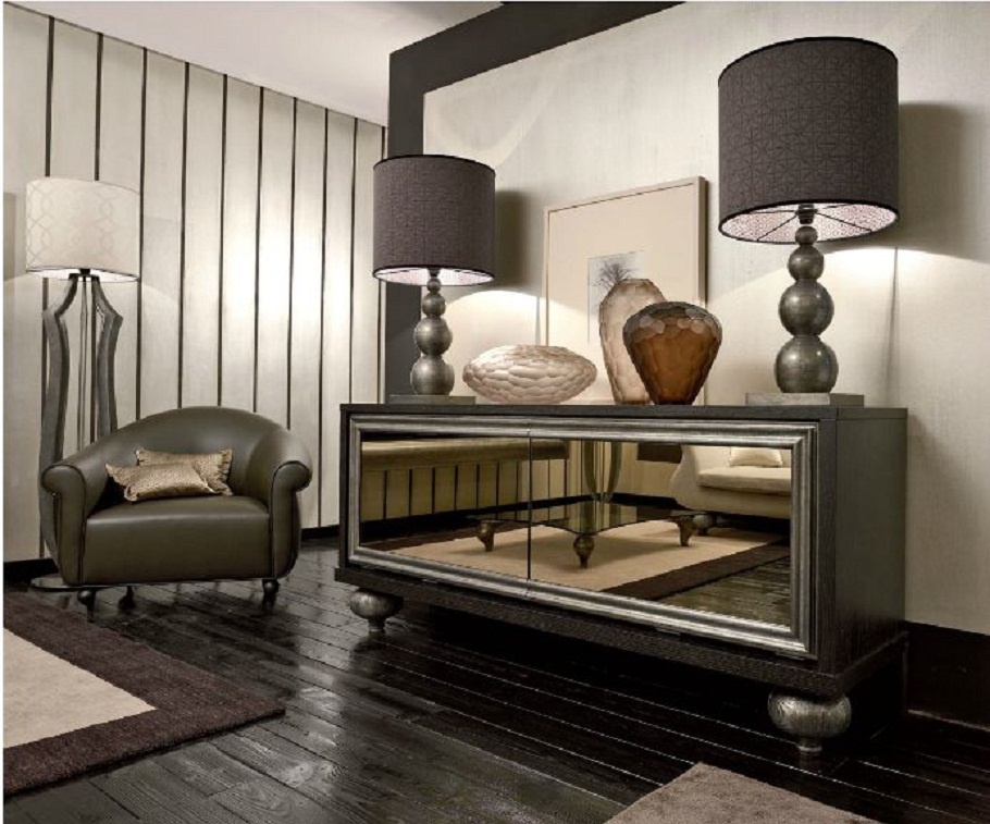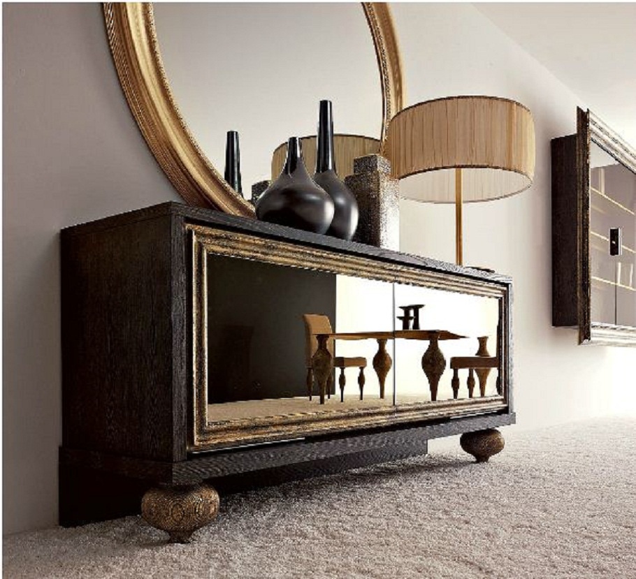 A snack bar Marrakech from the Italian manufacturer EGO. The frame is made of natural wood, the product complements the carved frame of oak. The two-door model, the doors can be made of glass, mirror or wood. The shelves are glass. The surface reproduces the natural wood pattern. The dresser is made in art Deco style.