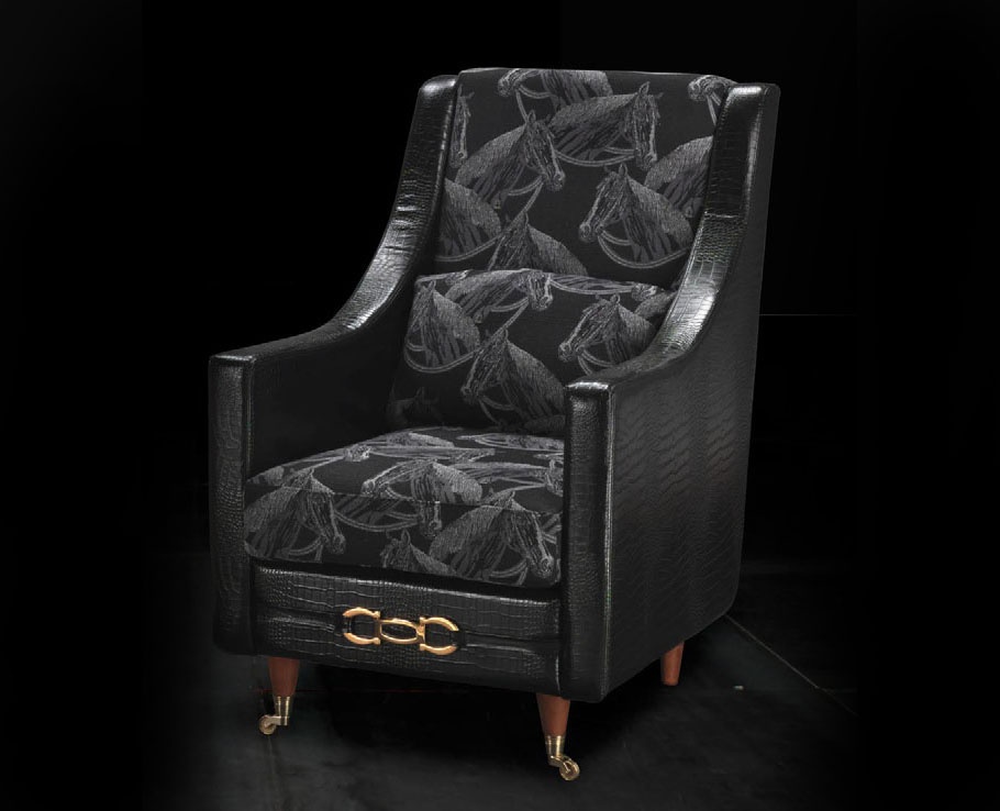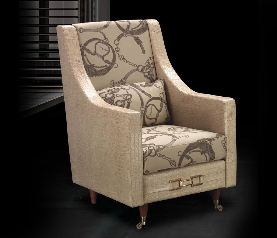 The Dover armchair from Italian manufacturer Formitalia, the collection Boutique. Wooden frame, upholstery leather or textiles from a range of companies. Front legs on castors. Offers a wide range of colors.