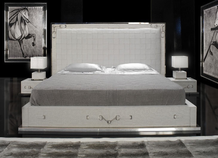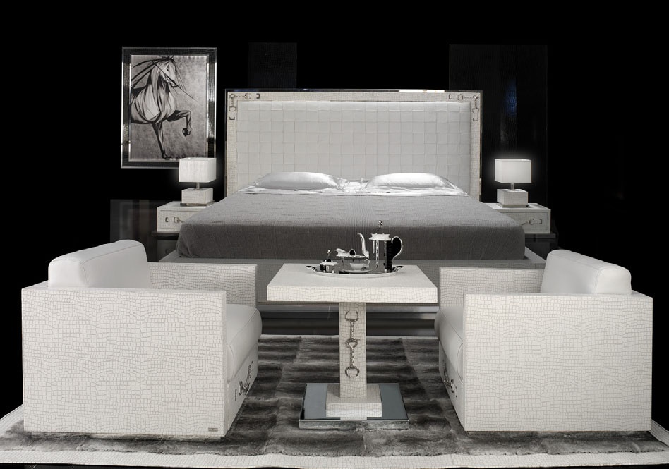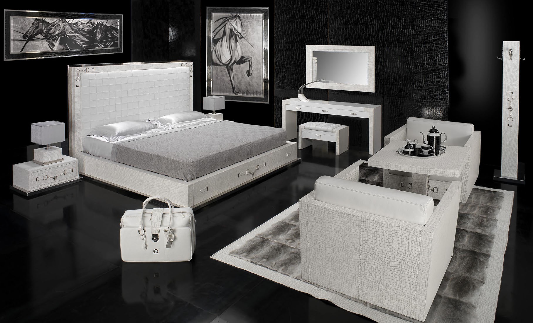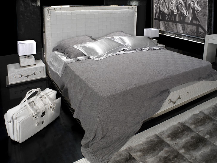 Master bedroom (bedroom set) Time Square from the Italian manufacturer Formitalia, the collection Boutique. Wooden frame, upholstered in natural leather or textiles from a range of companies, decoration are decorative metal items made of brass. Offers a wide range of colors.