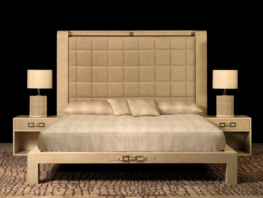 Double bed High Back Alabama from Italian manufacturer Formitalia. Model in a contemporary style from the collection Boutique. The frame is made of wood, upholstered in crocodile leather, decoration are decorative elements made of brass. Offers a wide range of colors.