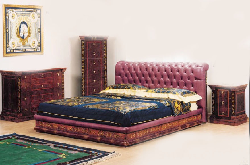 Hollywood bedroom set from the Italian manufacturer Formitalia Set in a classic style from the collection Boutique. Set consists of a double bed with high headboard in leather upholstery Burgundy color, bedside tables, cabinets high, with 7 drawers, drawers. The frame is made from natural wood veneer - elm, upholstery - leather, gold fittings. The surface is lacquered, semi-gloss. The main color is brown.