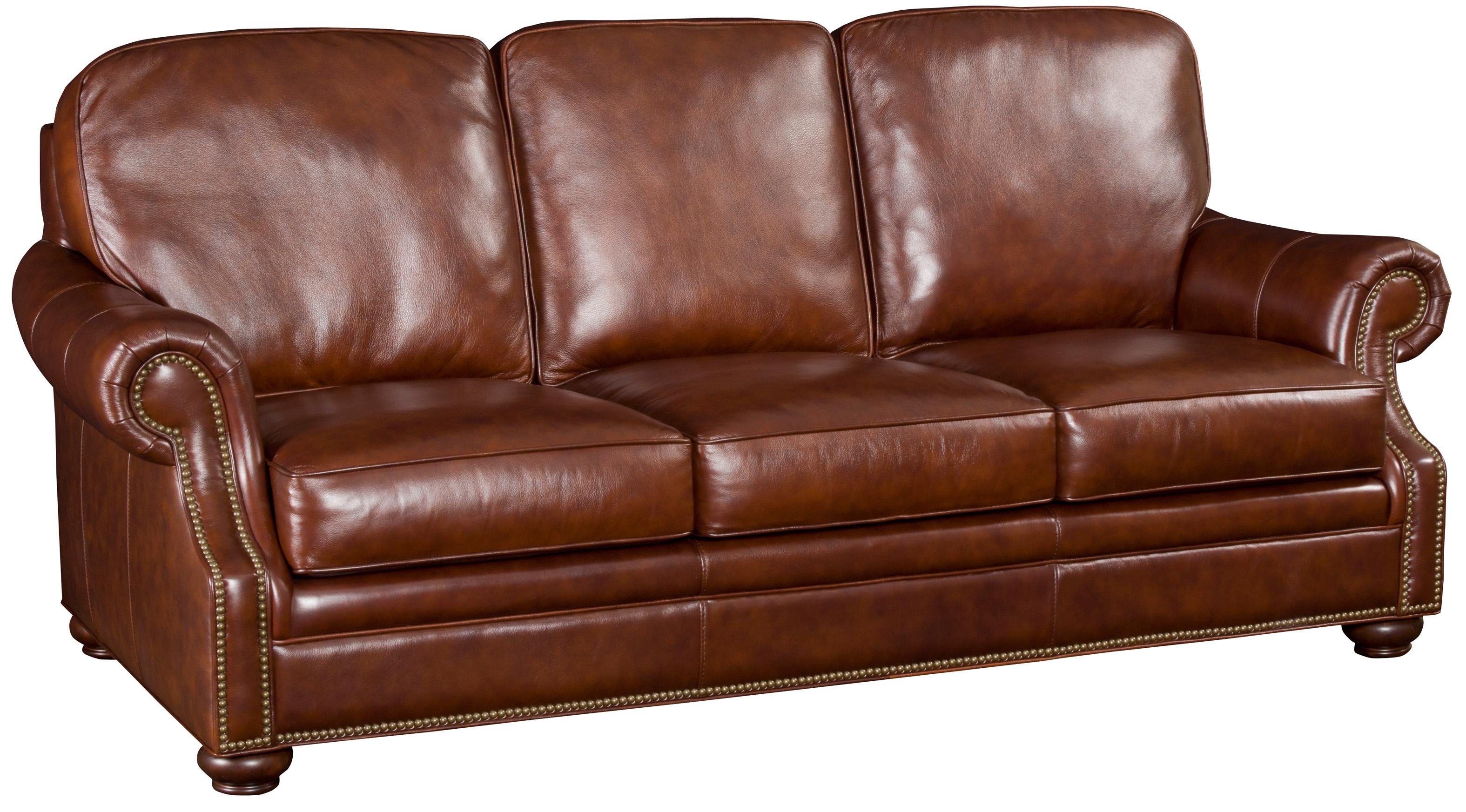 A sofa with a high back Stationary Sofa from American producer Bradington-Young. The frame and legs are made of wood. The leather upholstery. A removable seat cushion. Filler - polyurethane foam. Model with round armrests are decorated with furniture nails. The modern design. Colours in stock.