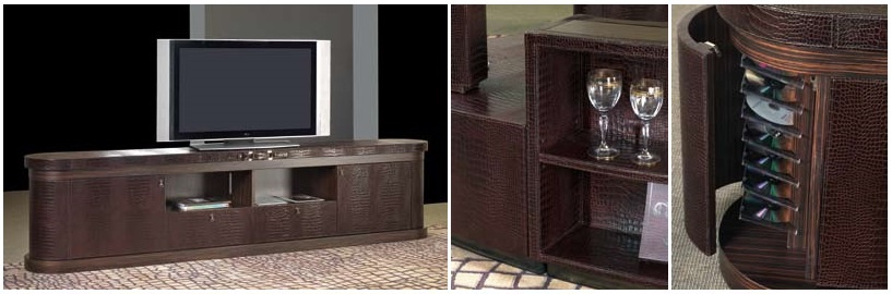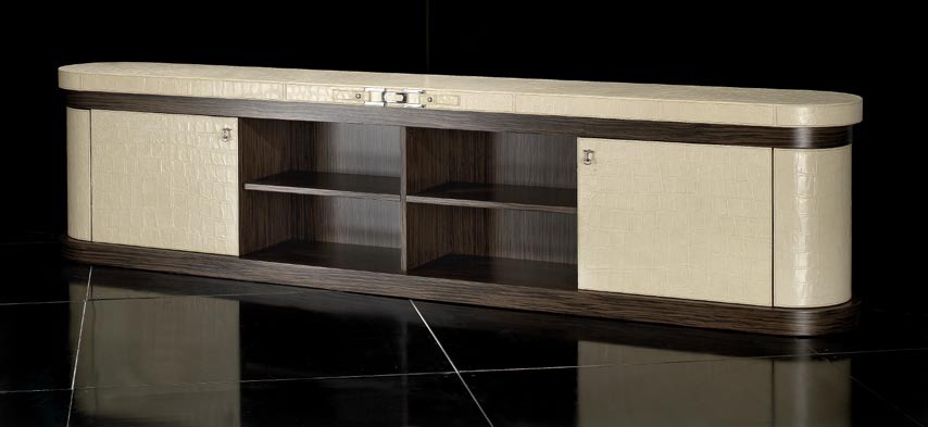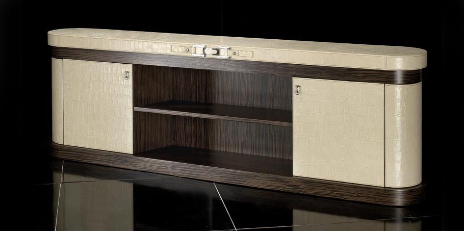 | Description: | Low Cabinet for TV Sitting A Round from the Italian manufacturer Formitalia. Padding - Shoco Nile Argyl. crocodile leather Nile. Finishing - veneer Malindi, semi-gloss. Accessories, decor of bright gold. The finish on the main picture. |