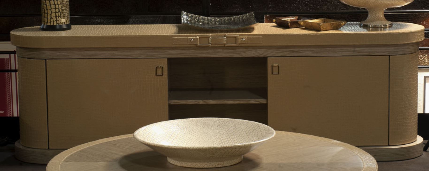 veneer: oak finish: crocodile leather accessories, decor: nickel coating: lacquered |