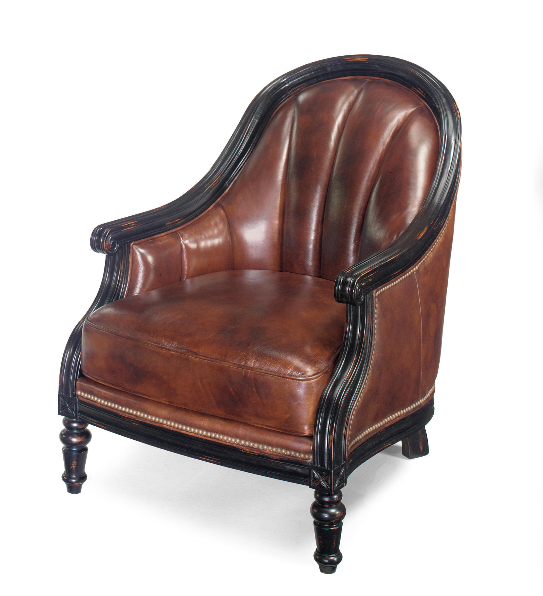 Chair Exposed Wood Club Chair from American producer Bradington-Young. Model in classic style with carved legs mahogany toned according to the catalogue of the manufacturer. Upholstery leather is embellished with decorative stitches and furniture nails. Available wide range of colors in the catalog of the company.
