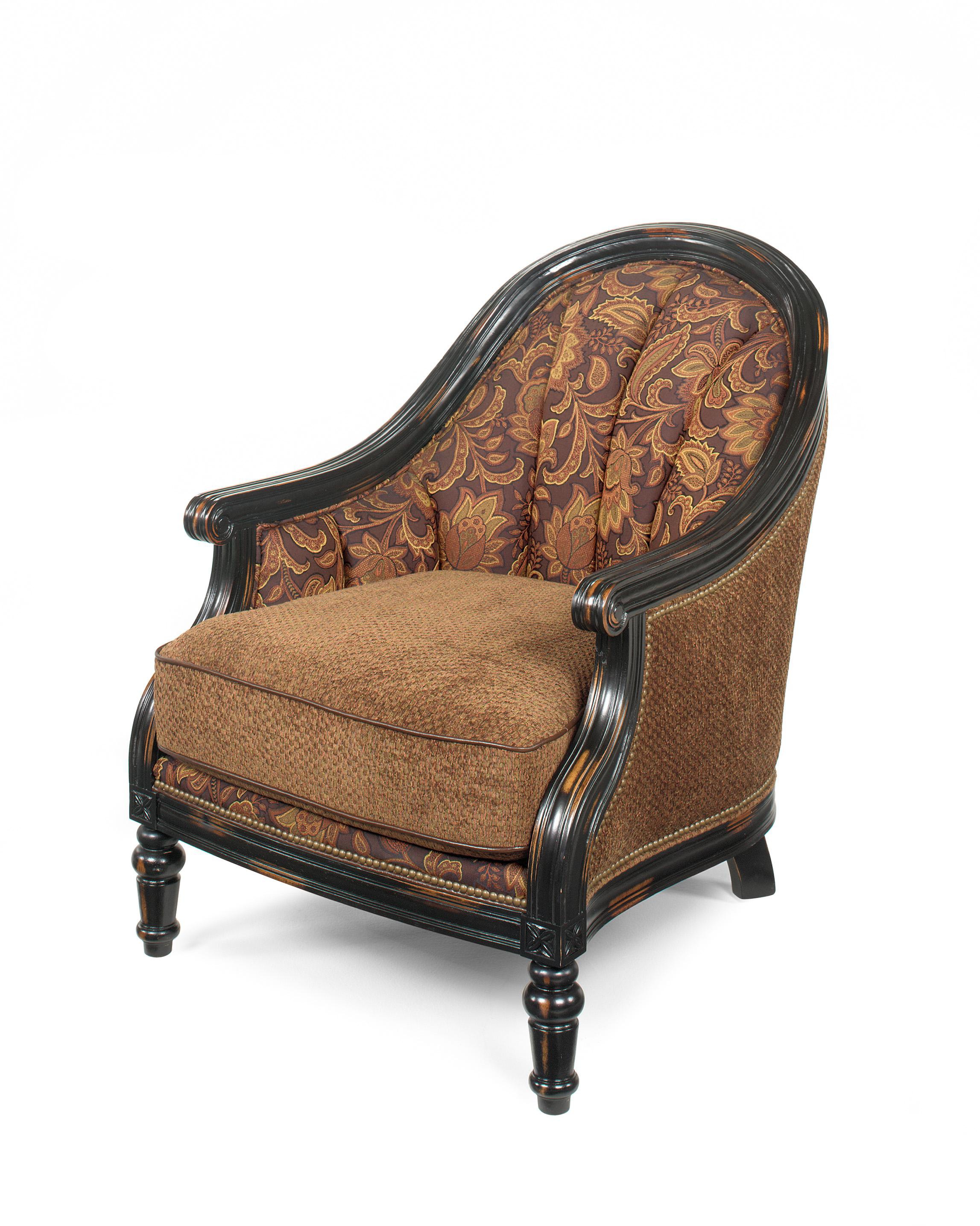 Chair Exposed Wood Club Chair from American producer Bradington-Young. Model in classic style with carved legs mahogany toned according to the catalogue of the manufacturer. Upholstery made of textile and leather with decorative stitches and furniture nails. The filler is not deformable polyurethane foam.