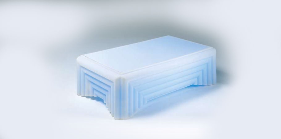 Table lamp with Blue light from the Italian manufacturer Formitalia. Model in a contemporary style from the collection of Miami Swing. Legs frame made of glass. The originality of the design gives a blue light.