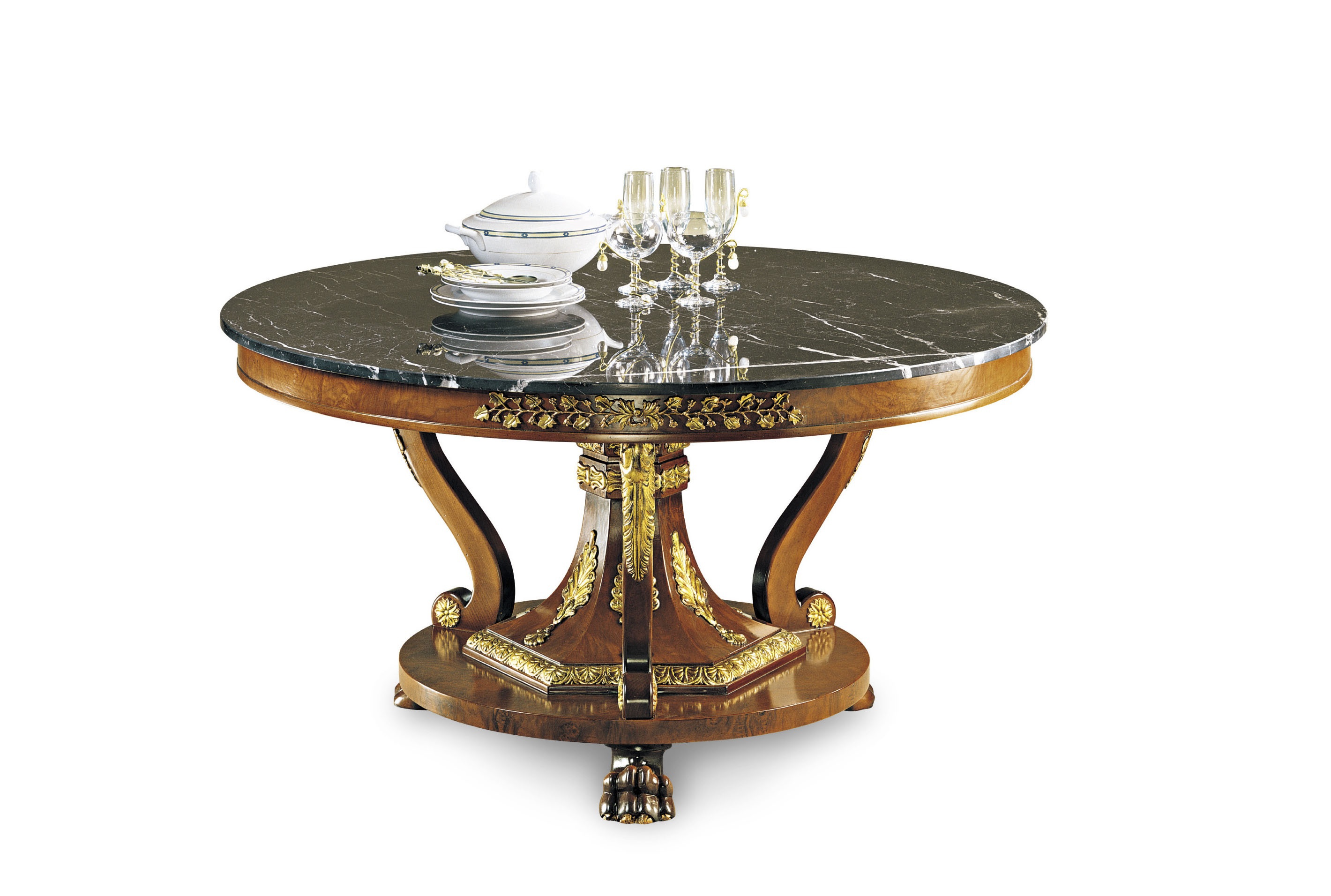 Dining table from the Italian manufacturer Francesco Molon, a collection of New Empire. The case is made of natural wood, decorated with carved elements and gold-plated finish. Top marble. The model is made in classic style. Colours in stock.