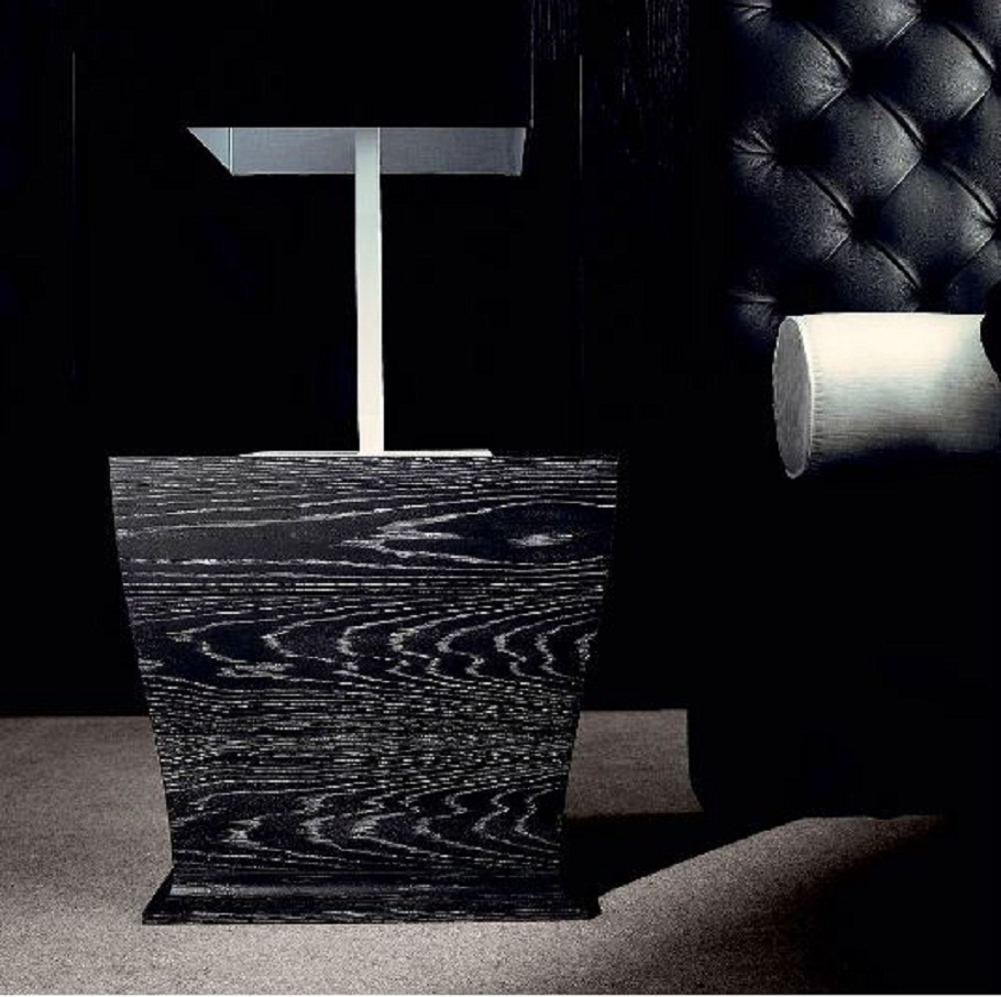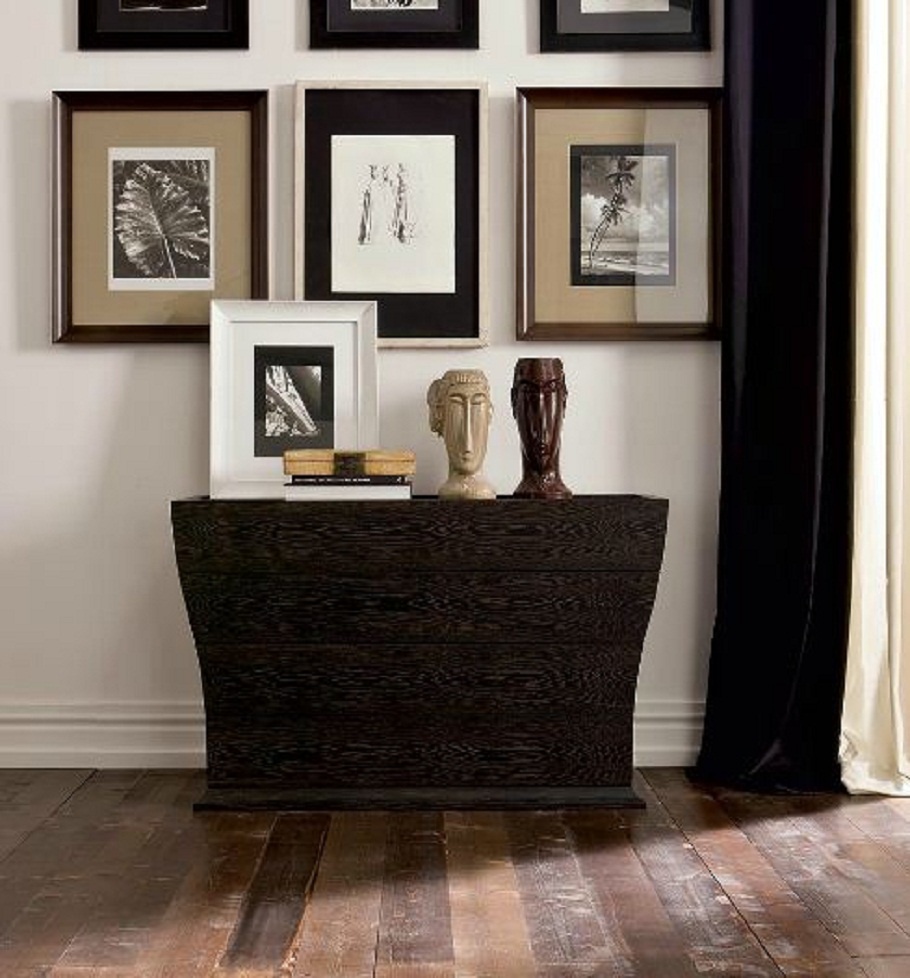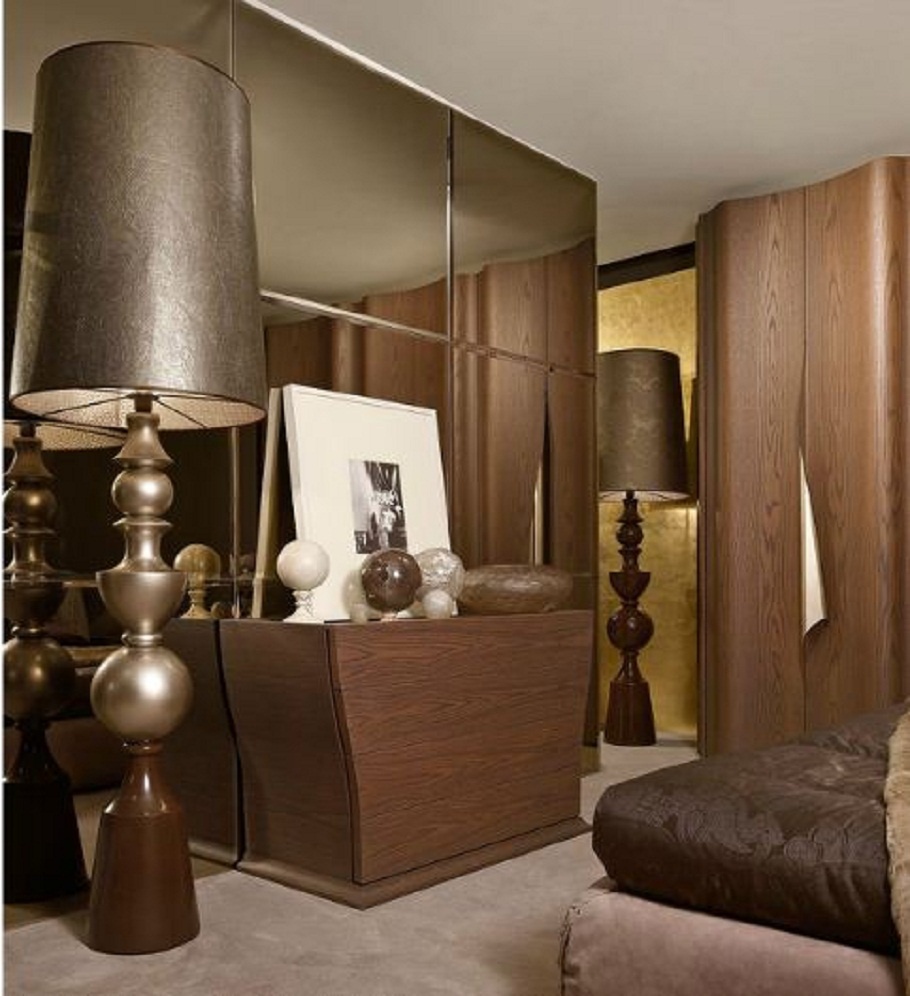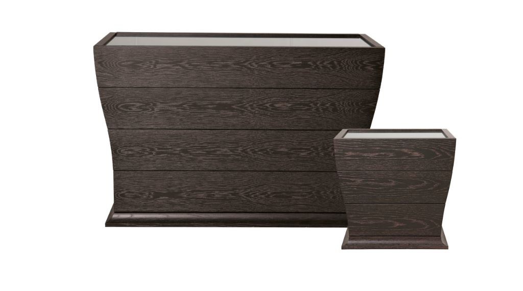 The Wave chest of drawers from Italian manufacturer EGO. The frame is made of wood. Tabletop metal. The curves model the same shape as the wave, with four drawers, and is complemented by a bedside table. Dresser dark brown color, made in a modern style.