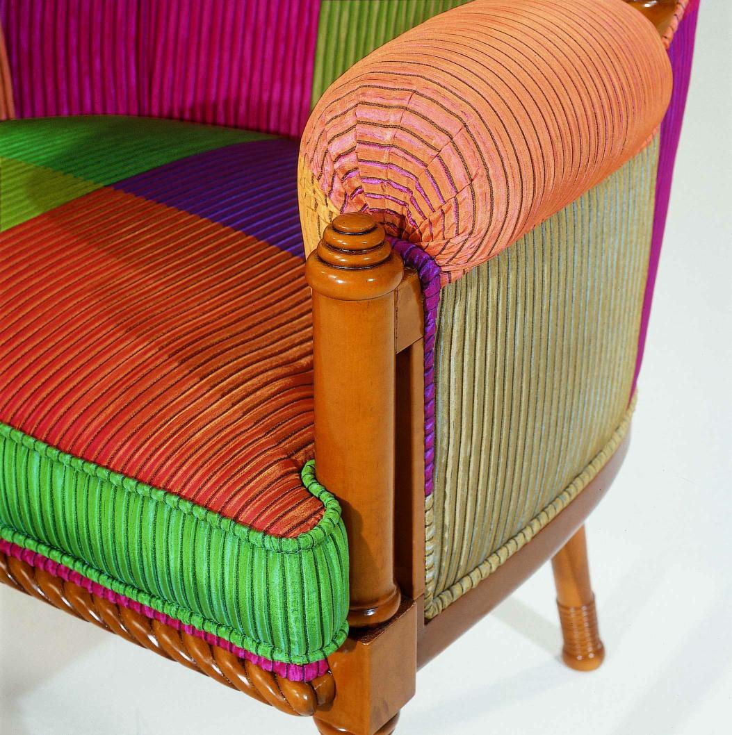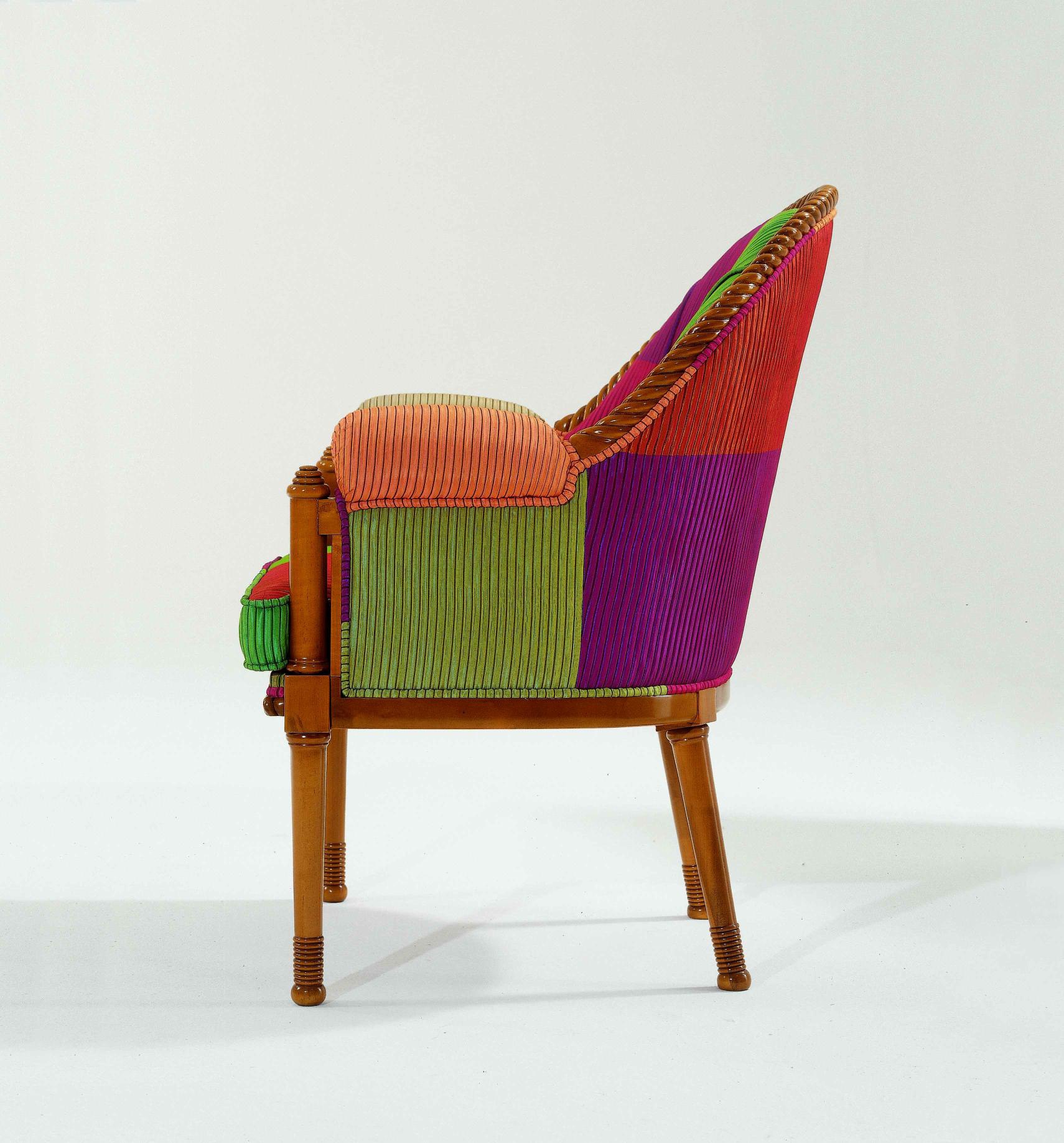 Armchair from Italian manufacturer Colombo Stile. The frame is made from solid wood. Upholstery - textiles from the company portfolio. The finishing - varnish. Filler - polyurethane foam. The model is made in fusion style. Bright colors, high, padded armrests, comfortable design and unique look of this chair will decorate the interior of any room, and create in it an atmosphere of comfort, joy and peace.