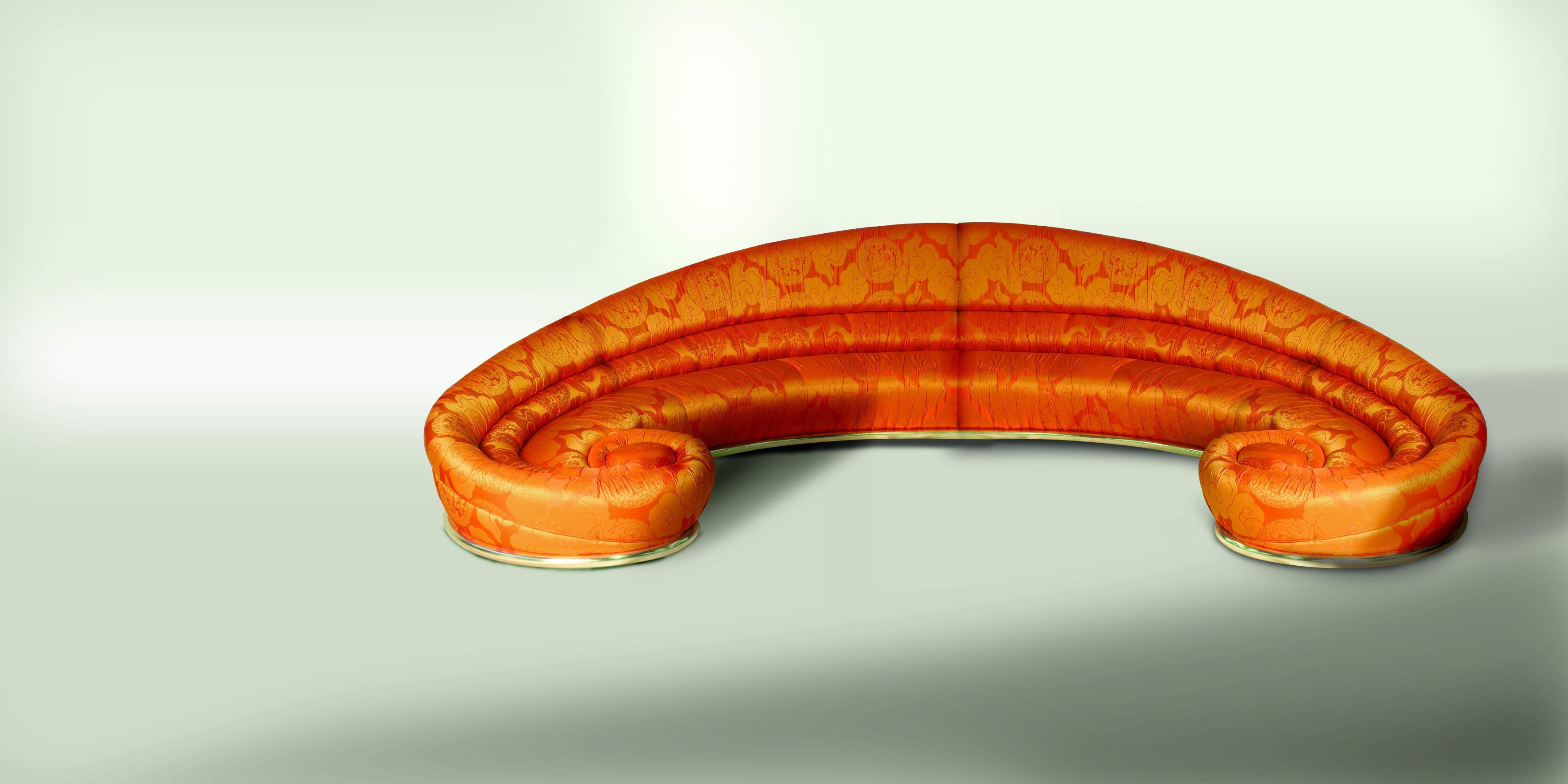 Semi-circular sofa is Soft And Crazy from Italian manufacturer Colombo Stile. The frame is natural wood. Finish: gold leaf with patina. Pictured is upholstered in silk fabric. The style is modern. Colours in stock.