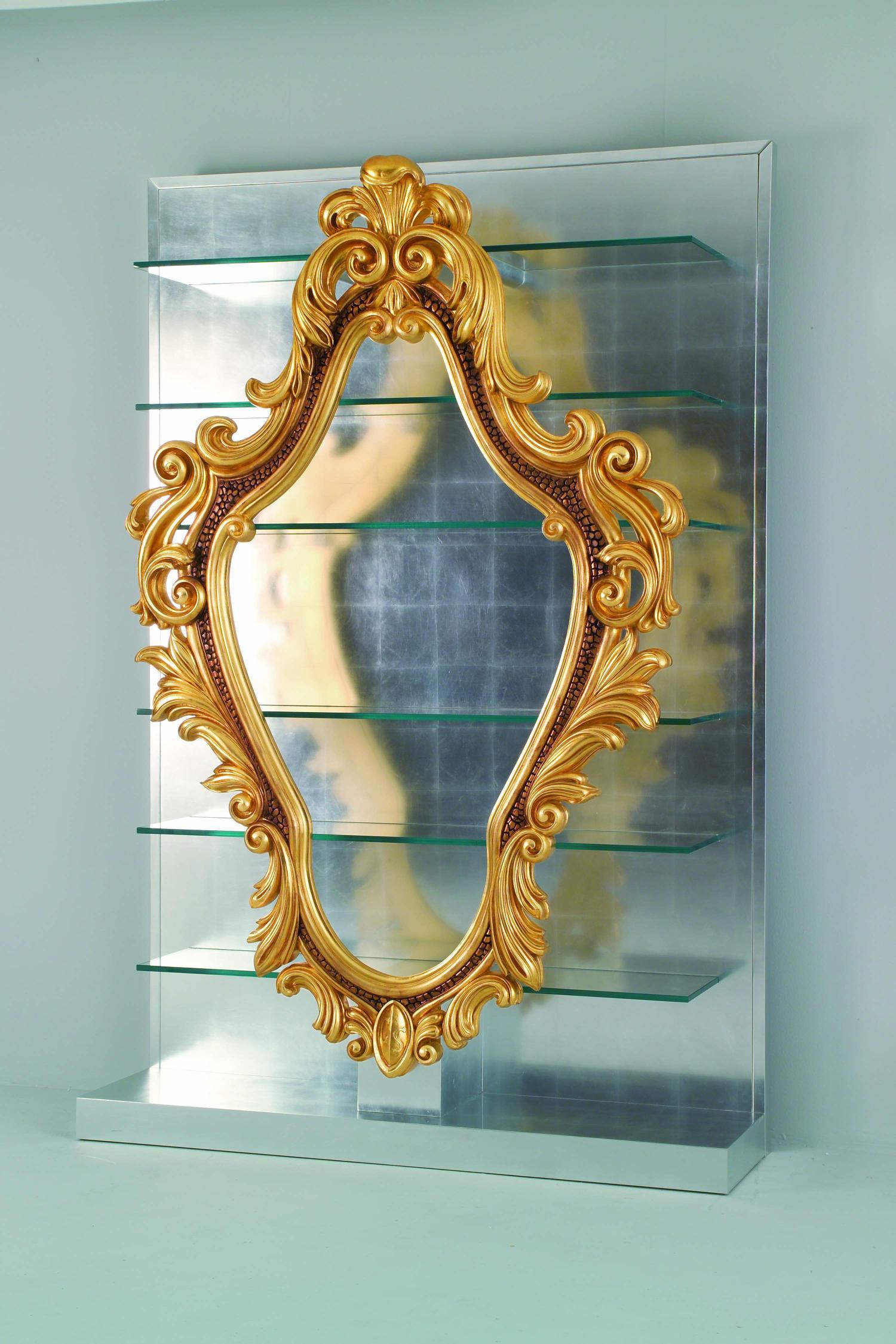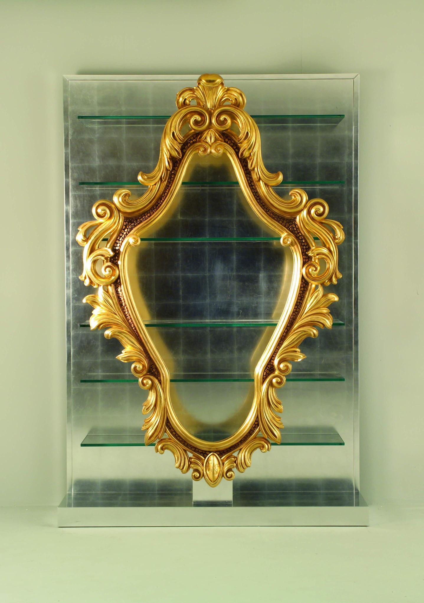 Bookshelf Soft And Crazy from Italian manufacturer Colombo Stile. Carving handmade by natural wood. Finish: silver and gold leaf with patina. The glass is thick. 15 mm. In the bottom of the frame