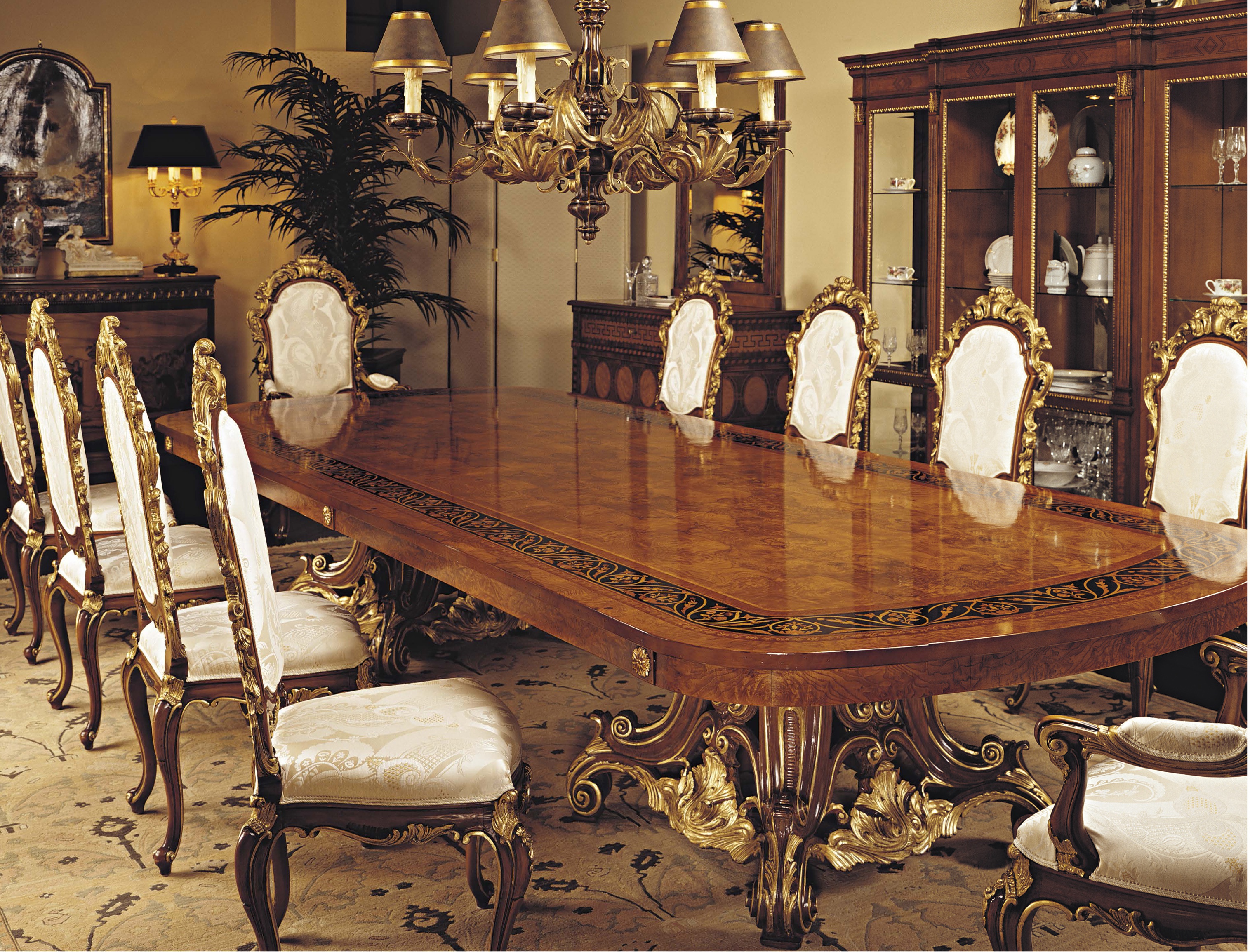 Dining table from the Italian manufacturer Francesco Molon, a collection of New Empire. The frame is made from natural wood top and inlay. The model is abundantly decorated with carvings handmade. Colours in stock.
