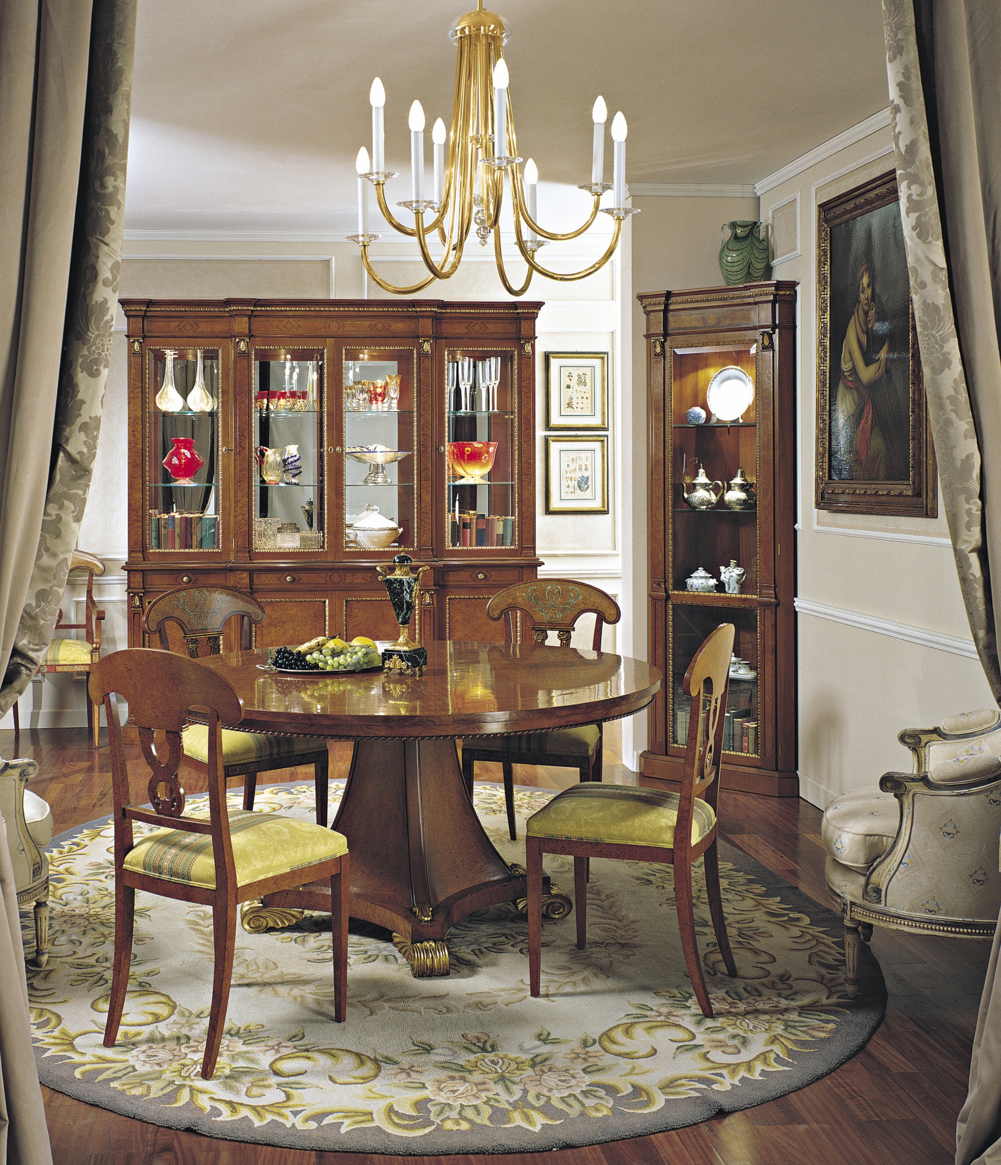 Dining table from the Italian manufacturer Francesco Molon, a collection of New Empire. The case is made of natural wood. Decorative elements in gold plated finish. Model in the classic style. Colours in stock.