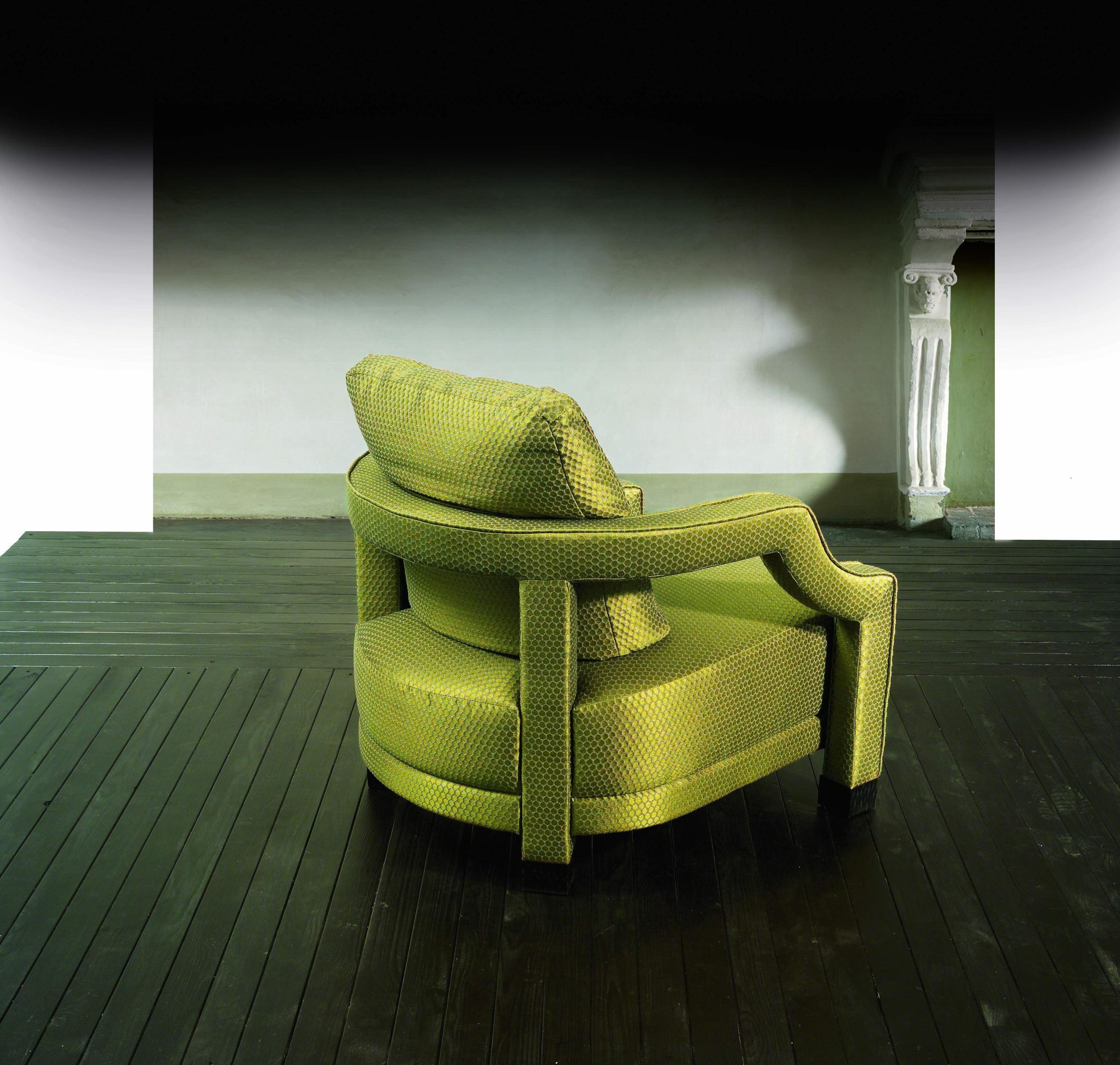 Tarsie chair from Italian manufacturer Colombo Stile. Katana wooden structure. Carved wooden legs. Pictured in fabric