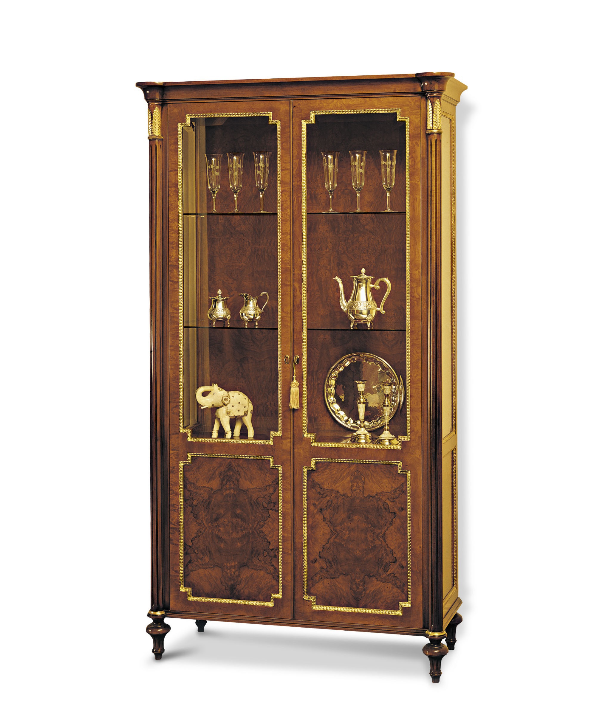 Showcase from Italian manufacturer Francesco Molon. Model from the collection of the New Empire made of wood, the carving done by hand. Decorative elements in gold plated finish. Colours in stock.