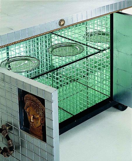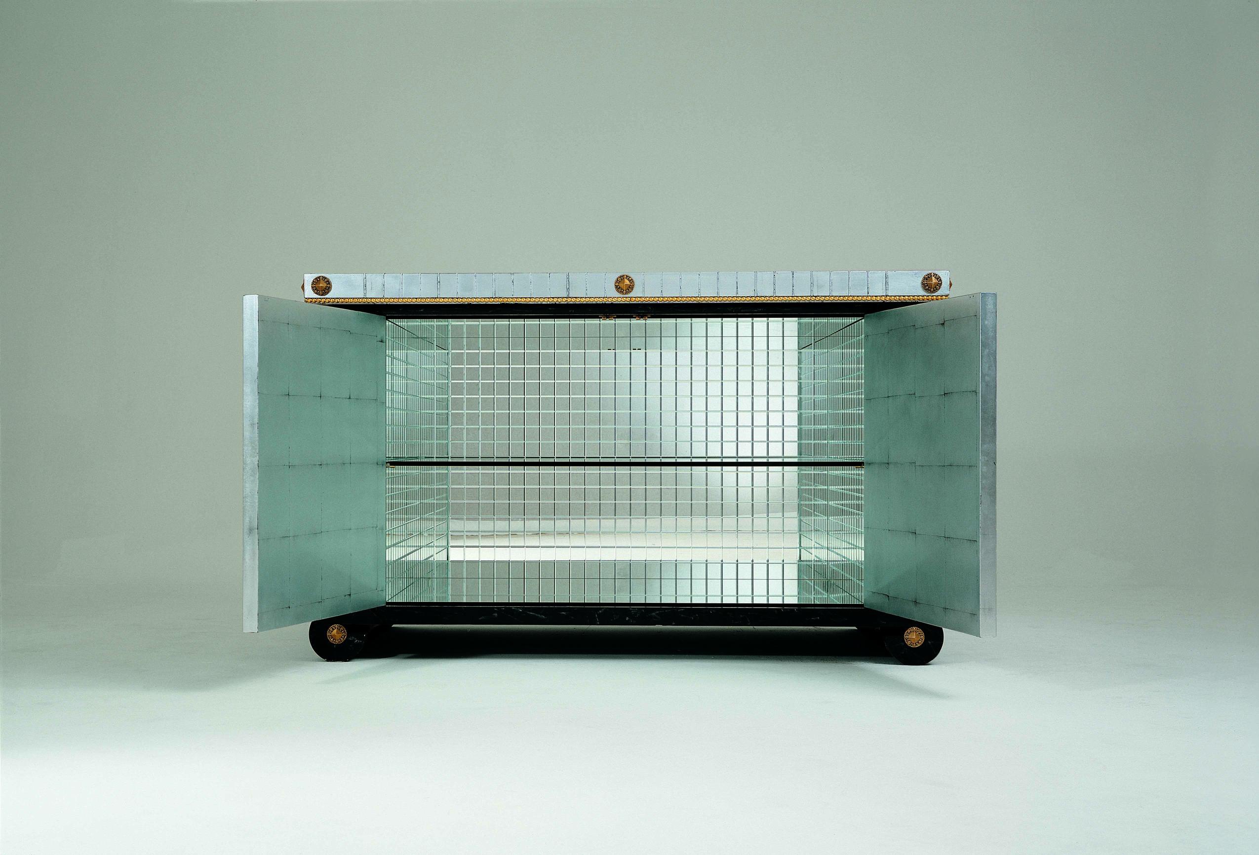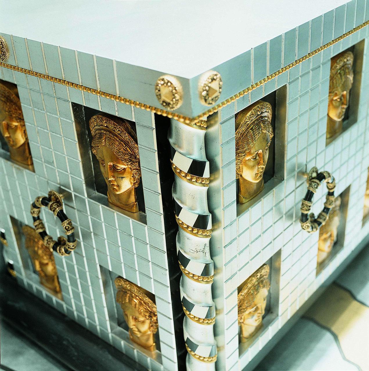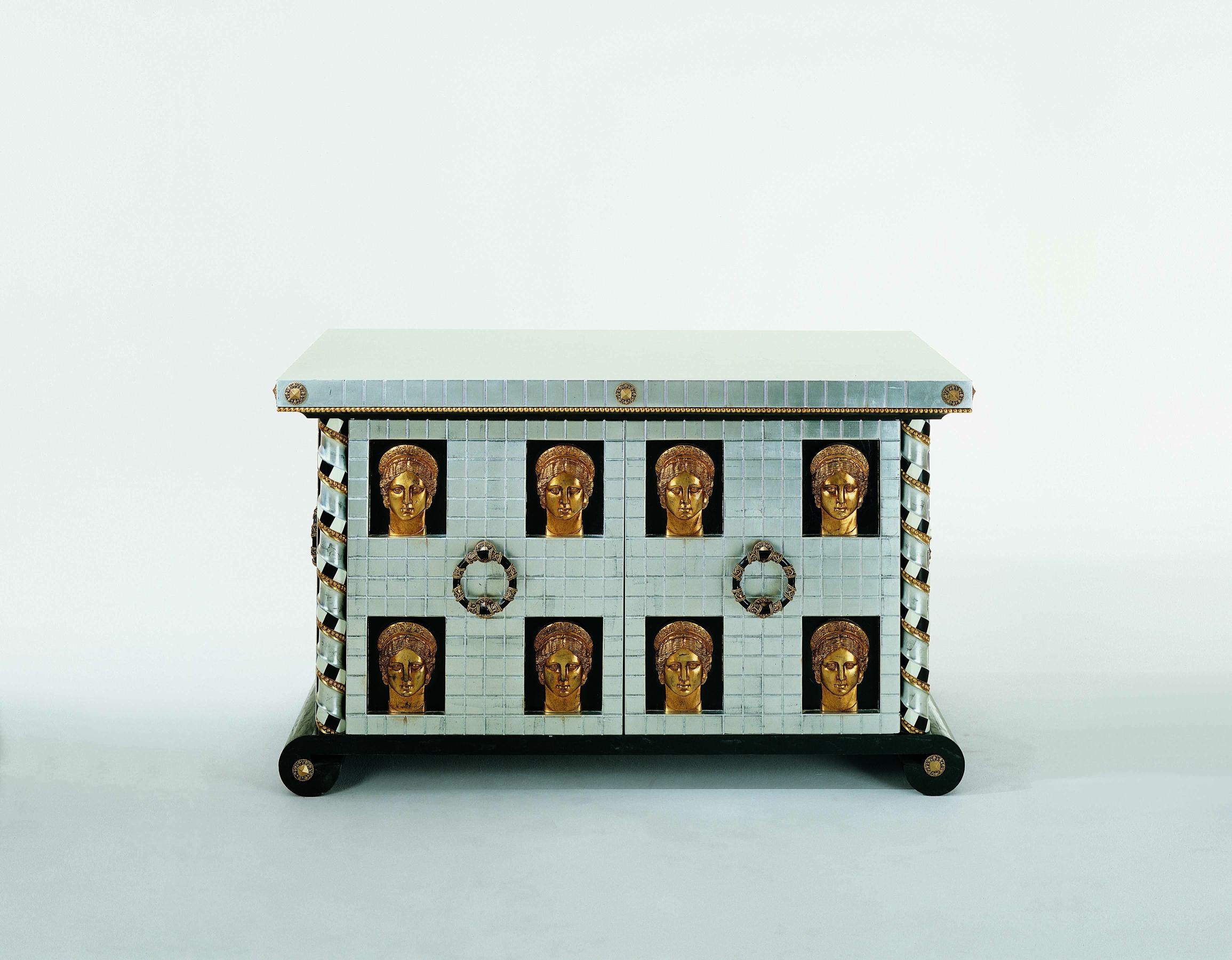 Leggende Future stand from Italian manufacturer Colombo Stile. The case is natural wood. Mirrored shelves. Finish: - silver and gold leaf. Columns with decorations in white and black lacquer. The model is made in modern style. Colours in stock.