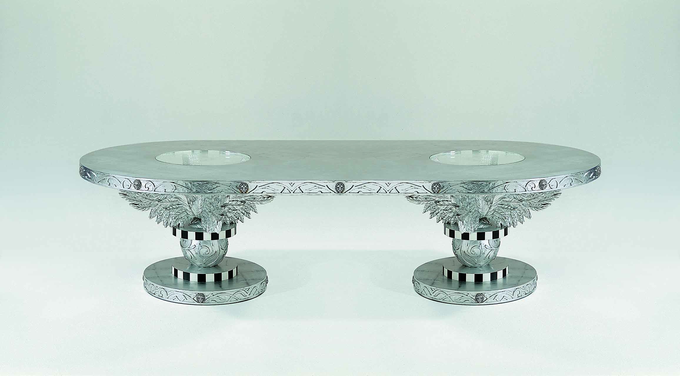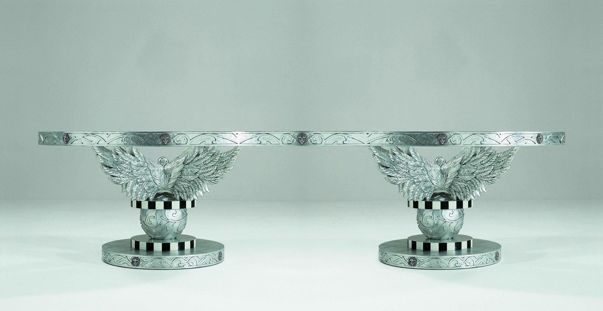 Dining table Leggende Future from the Italian manufacturer Colombo Stile. Legs, table top - natural wood. Finish - silver foil. Adornment of black and white lacquer in bronze dipped in silver. Colours in stock.