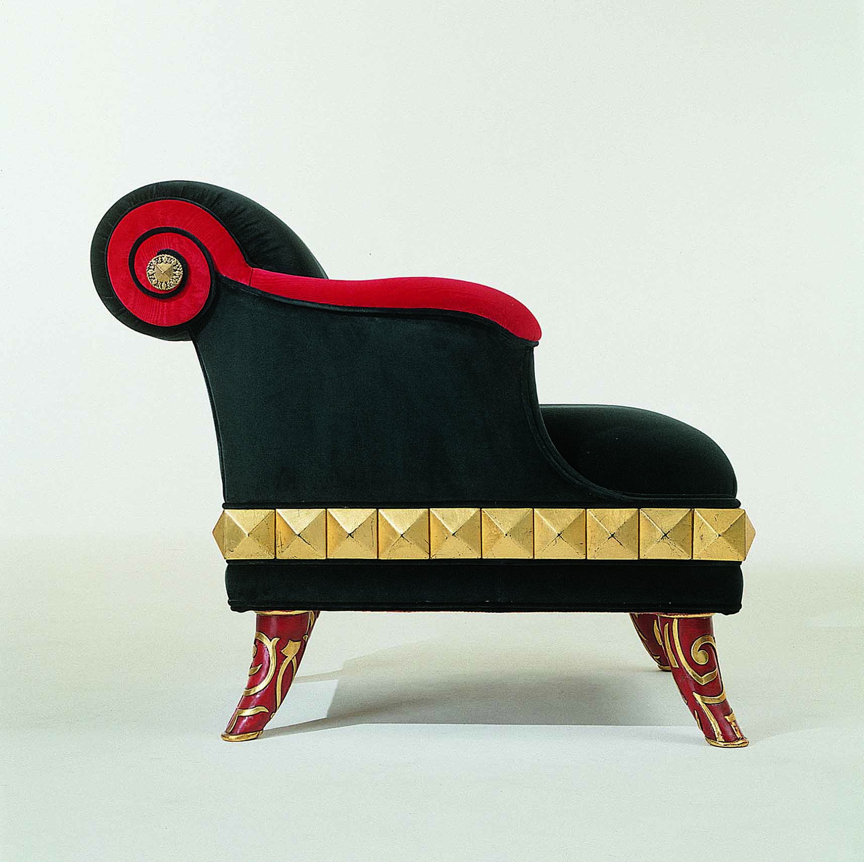 Chair Invito Al Viaggio by the Italian manufacturer Colombo Stile. The frame is natural wood. The finish is lacquer, gold leaf, decorations in bronze. The style is eclectic. Colours in stock.