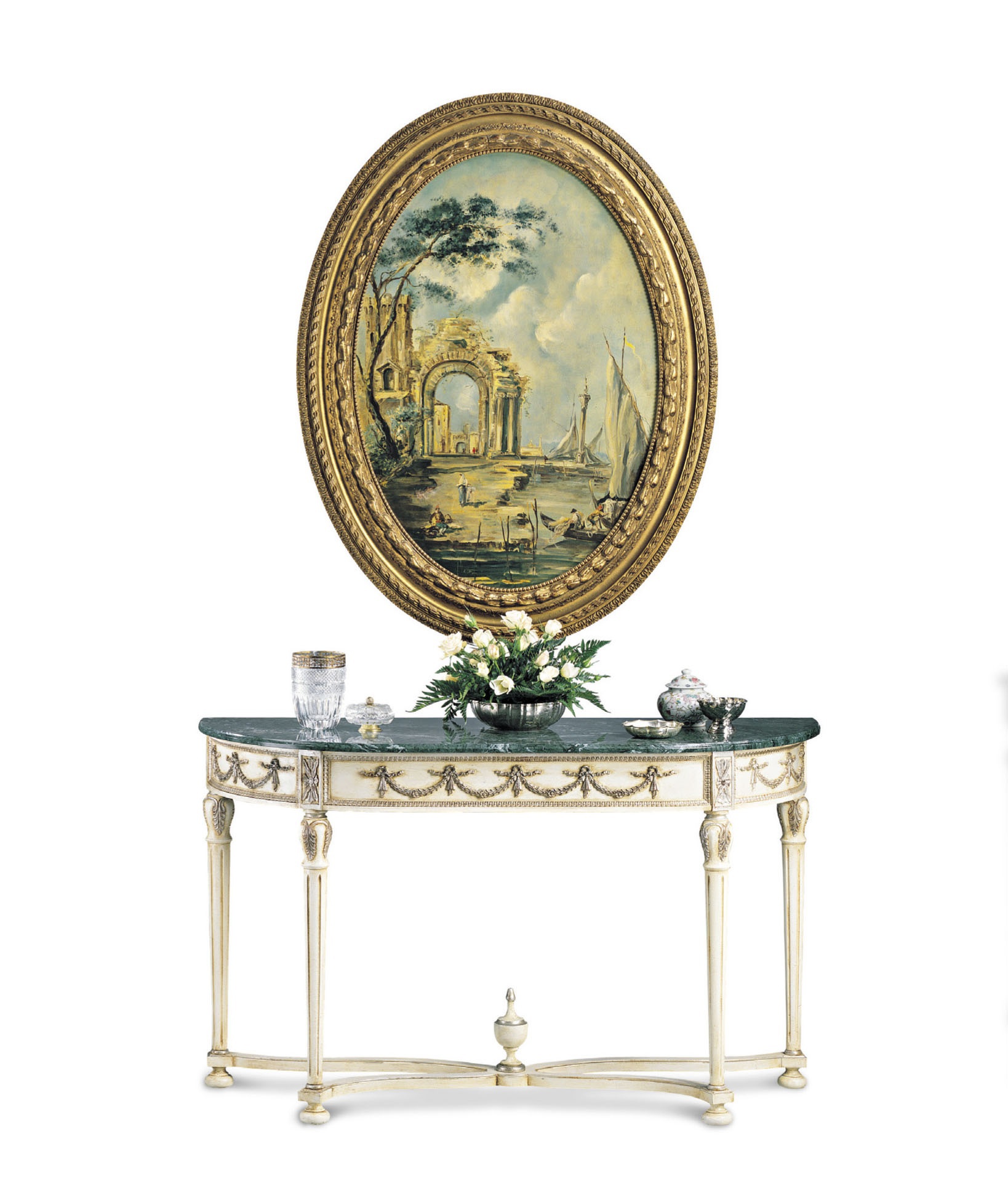 The console from the Italian manufacturer Francesco Molon, a collection of New Empire. Model in classic style made of natural wood, decorated with handmade carving. Top marble. Decorative elements in gold plated finish. Colours in stock.