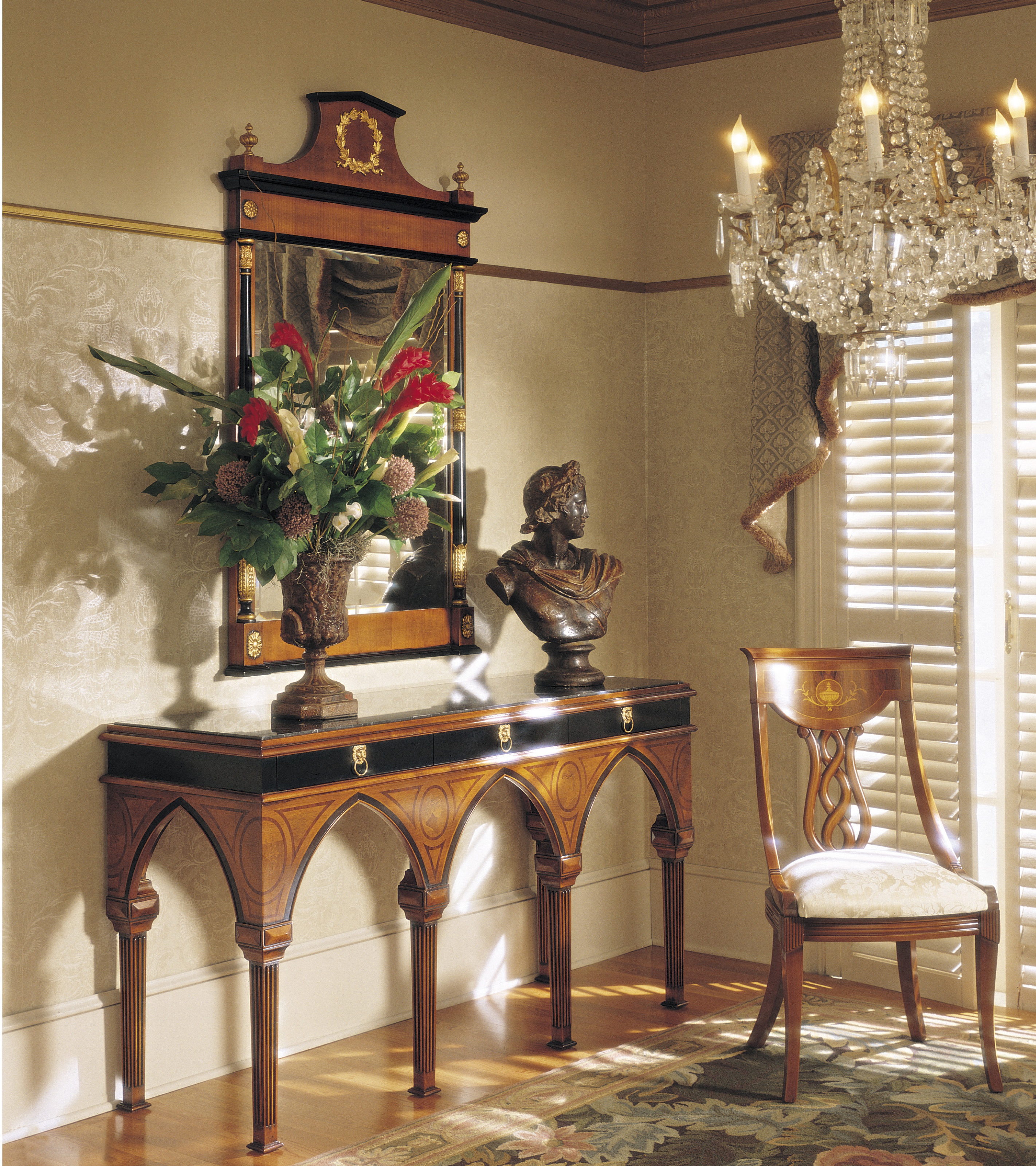The console from the Italian manufacturer Francesco Molon, a collection of New Empire. Model in classic style made of natural wood, decorated with inlay. Top marble. Colours in stock.