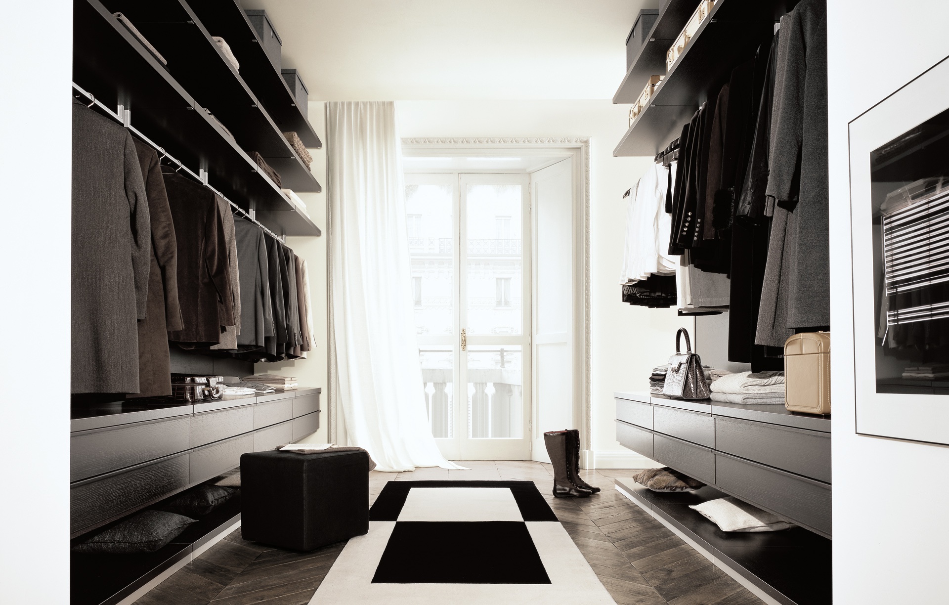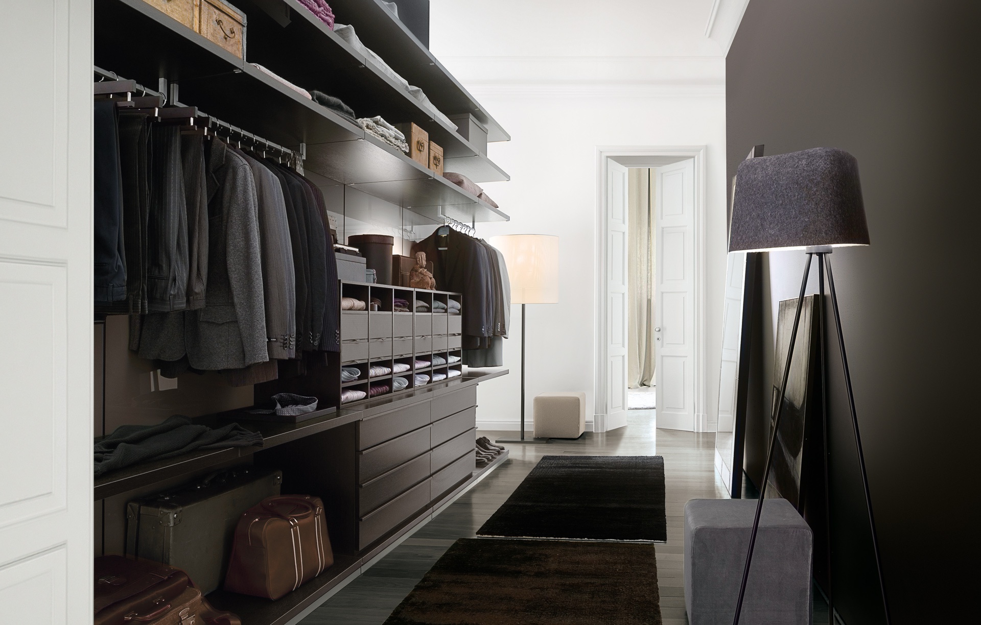 Modular storage system Ubik Italian manufacturer Poliform. Walk-in closet where functionality and style are the same. Large selection of convenient features: pull-out Shoe racks, Trouser hanger, special units for belts and ties, as well as, the function "lift", for convenience. Provided trays for small items, a roomy shelves, drawers with a facade of wood or glass. Panel components and systems Ubik laminated. A choice of 4 finishes: oak, wengu, walnut, white pine. Materials resistant to moisture and scratches. The factory guarantees the quality of materials, reliability and long service life . Size range back in stock. A modern solution for the interior dressing.