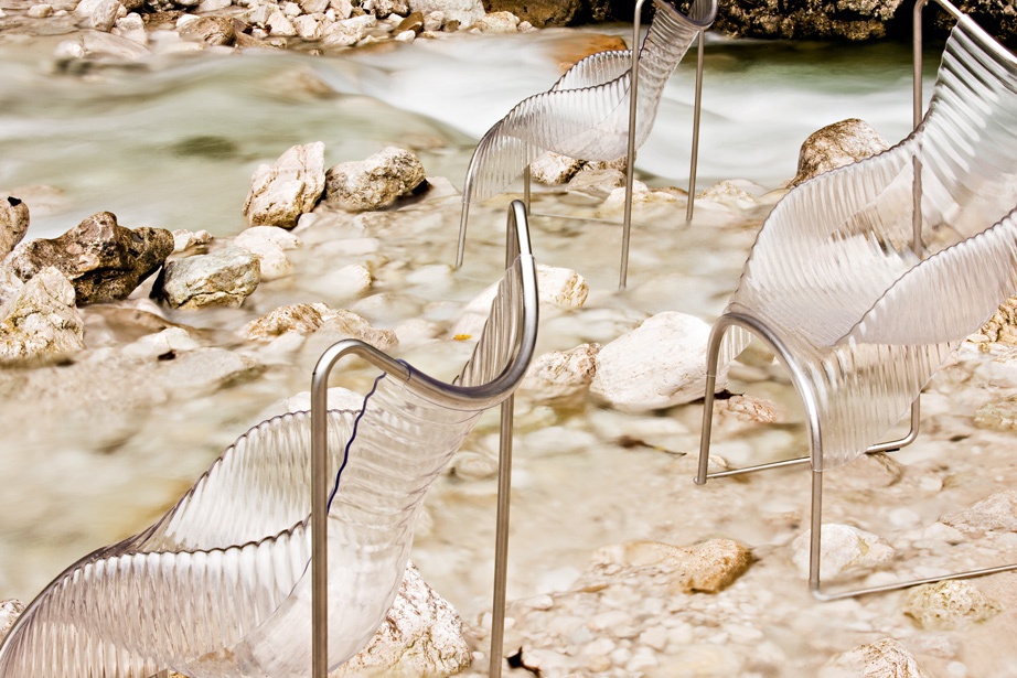 The Wavy chair from the Italian manufacturer Moroso. The frame is made of stainless steel or of steel tubes painted in black. The undulating shape of the seat is made of plastic in black, red, gray or transparent color. The model is made in a modern style, designed for use on the street.
