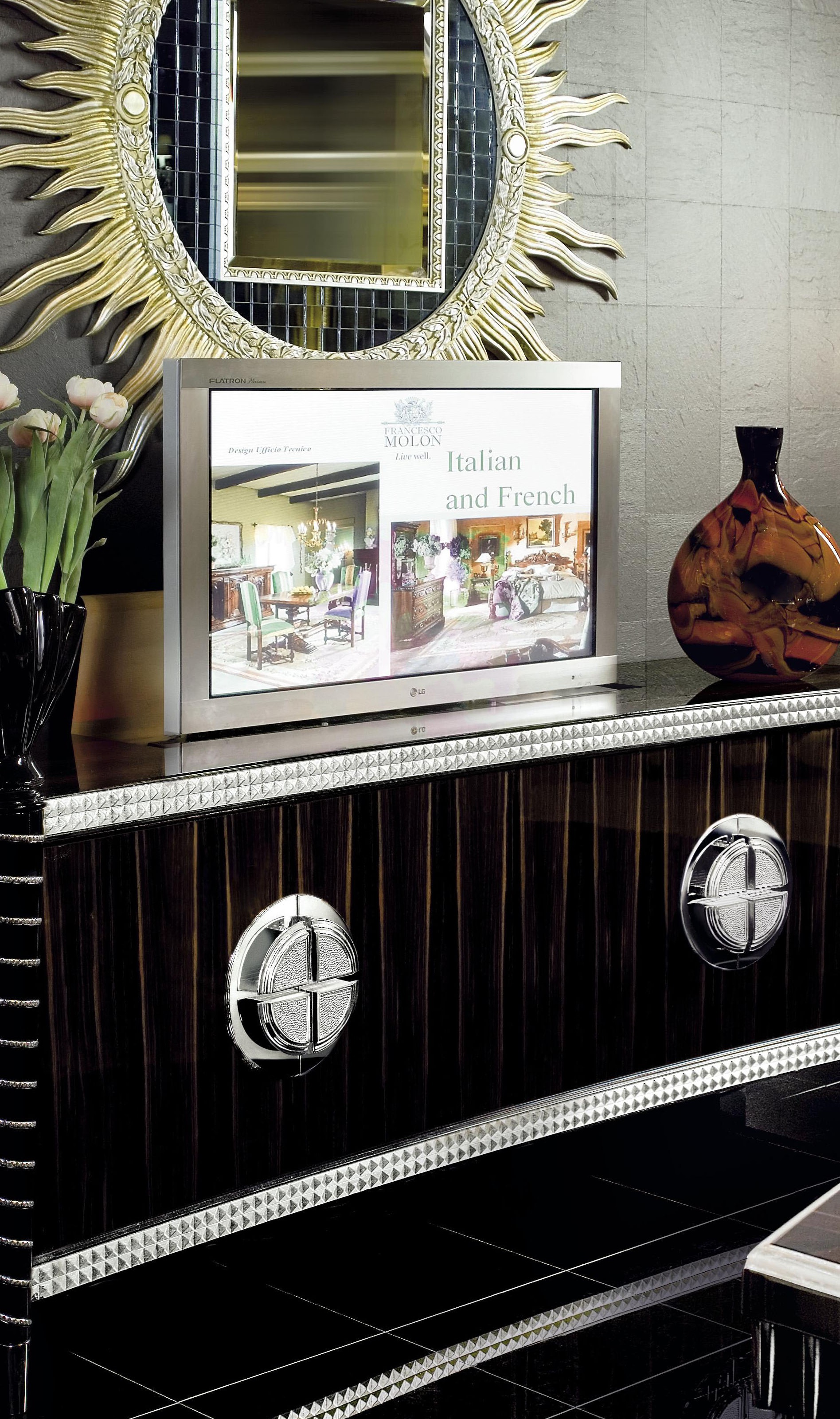Tortiglione stand from Italian manufacturer Francesco Molon, a collection of Eclectica. The model is made of natural wood, decorated with carved elements. 2 options available: with lift for TV and without. Colours in stock.
