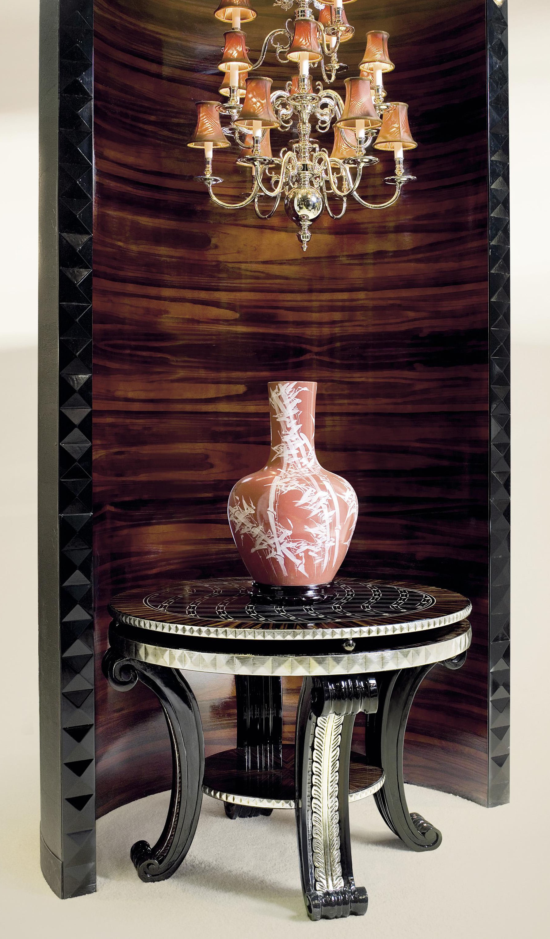 Round dining table from the Italian manufacturer Francesco Molon, a collection of Eclectica. The model is in standing style made of natural wood. The table top is decorated with inlay. Decor - hand carved in silver plated finish. Colours in stock.