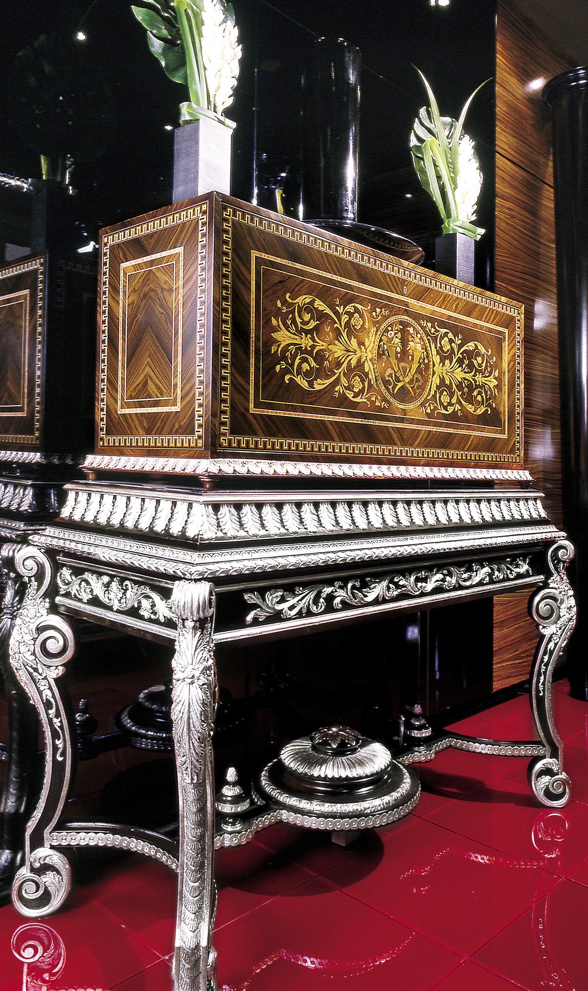 case: wood decorative elements: silver plated legs: carved decor: inlay |
