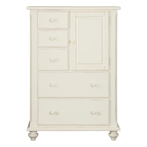 Dresser - chest Benbrooke from the American manufacturer Bassett. Made of wood with carved legs. The model has five drawers with extended rails and hinged door. Available with different finishes and colors. Unique vintage design in Provence style.