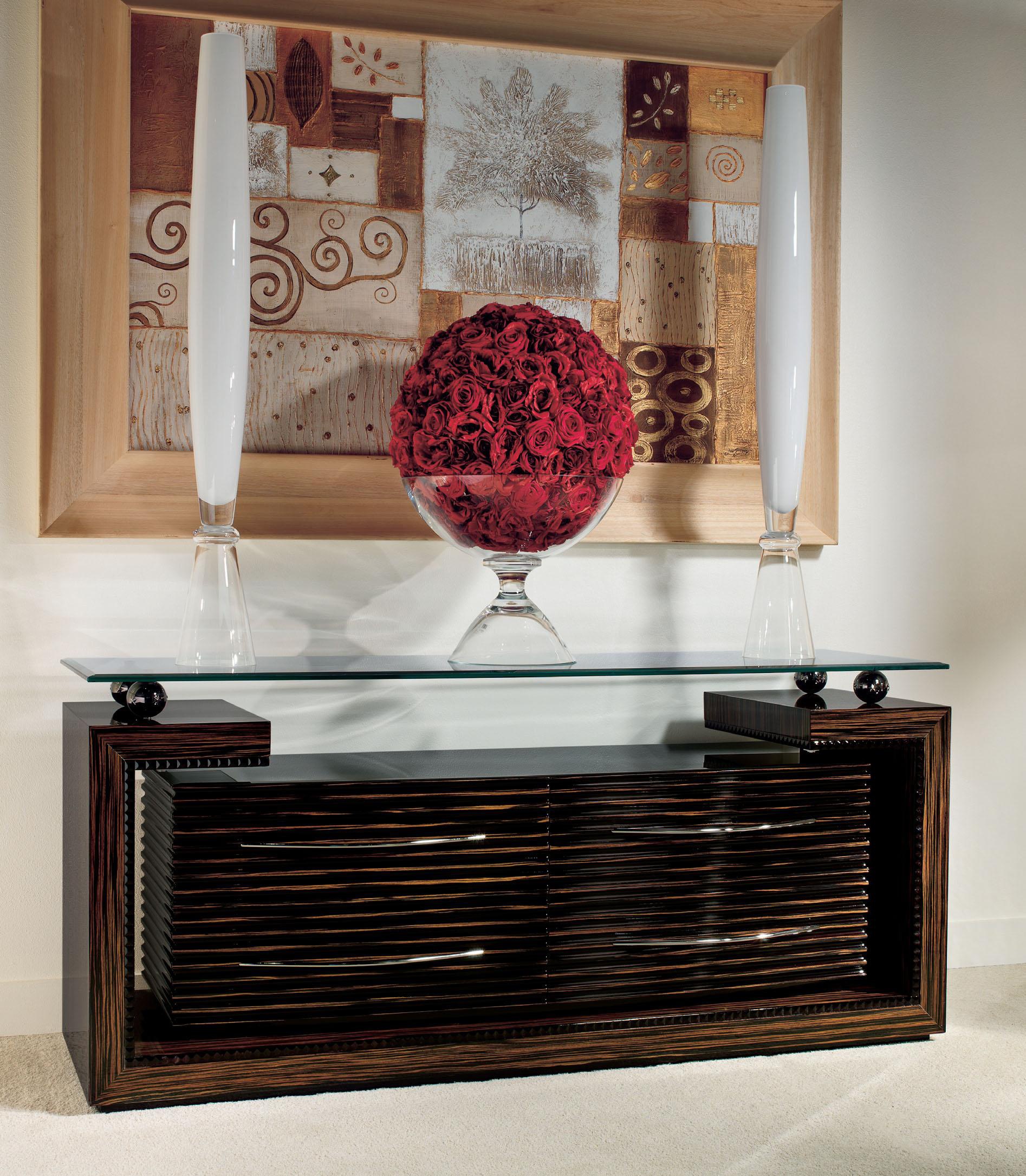 Precious stand from Italian manufacturer Francesco Molon, a collection of Eclectica. The model is in modern style. The case of natural wood, finished with veneer of valuable species. The top glass. Colours in stock.